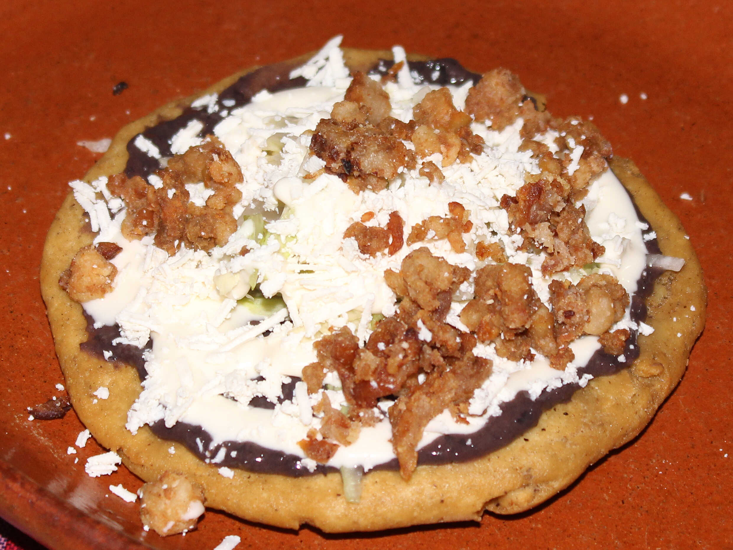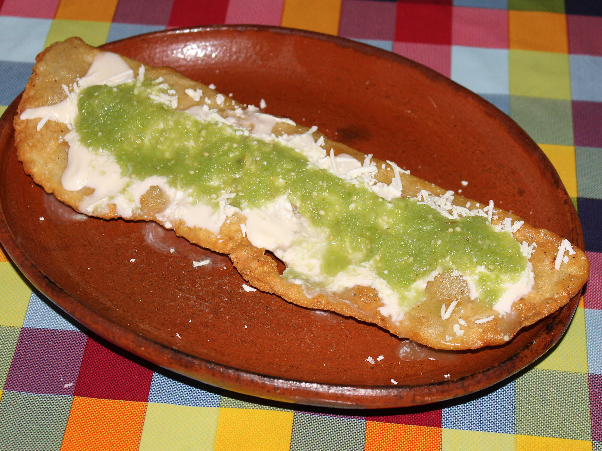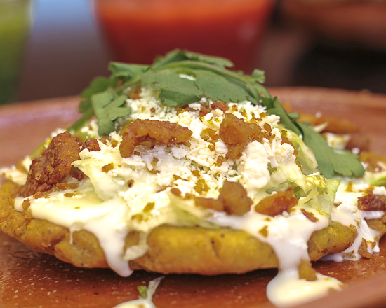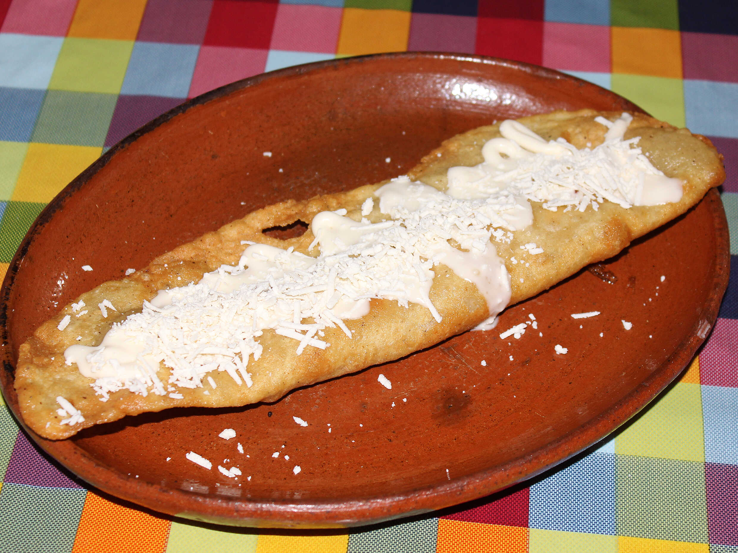 De masa frita preparada con frijoles lechuga crema queso y chicharrón (tlalito)