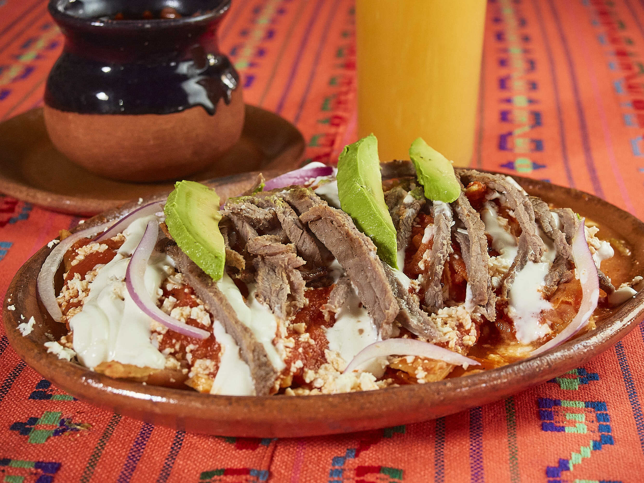 Tortilla crujiente bañada de salsa roja, con crema, queso, aguacate, cebolla y arrachera.