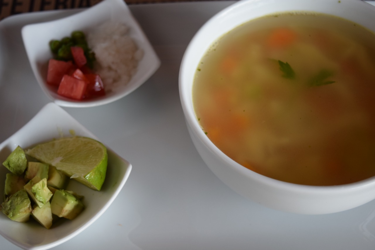 Caldo con pollo desmenuzado y verduras. Guarnición: limón, aguacate y cebolla.
