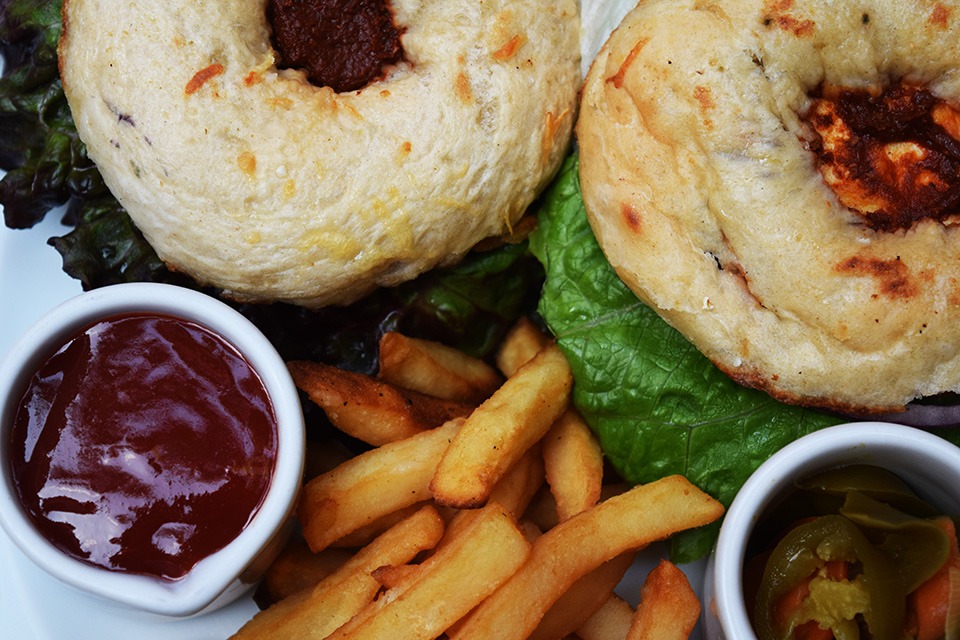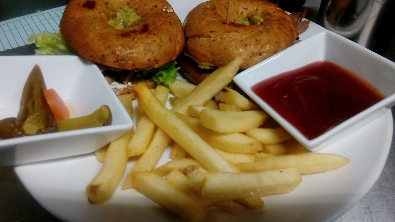 Carne molida, lechuga, queso tipo americano y tocino. Guarnición: papas a la francesa o gajo