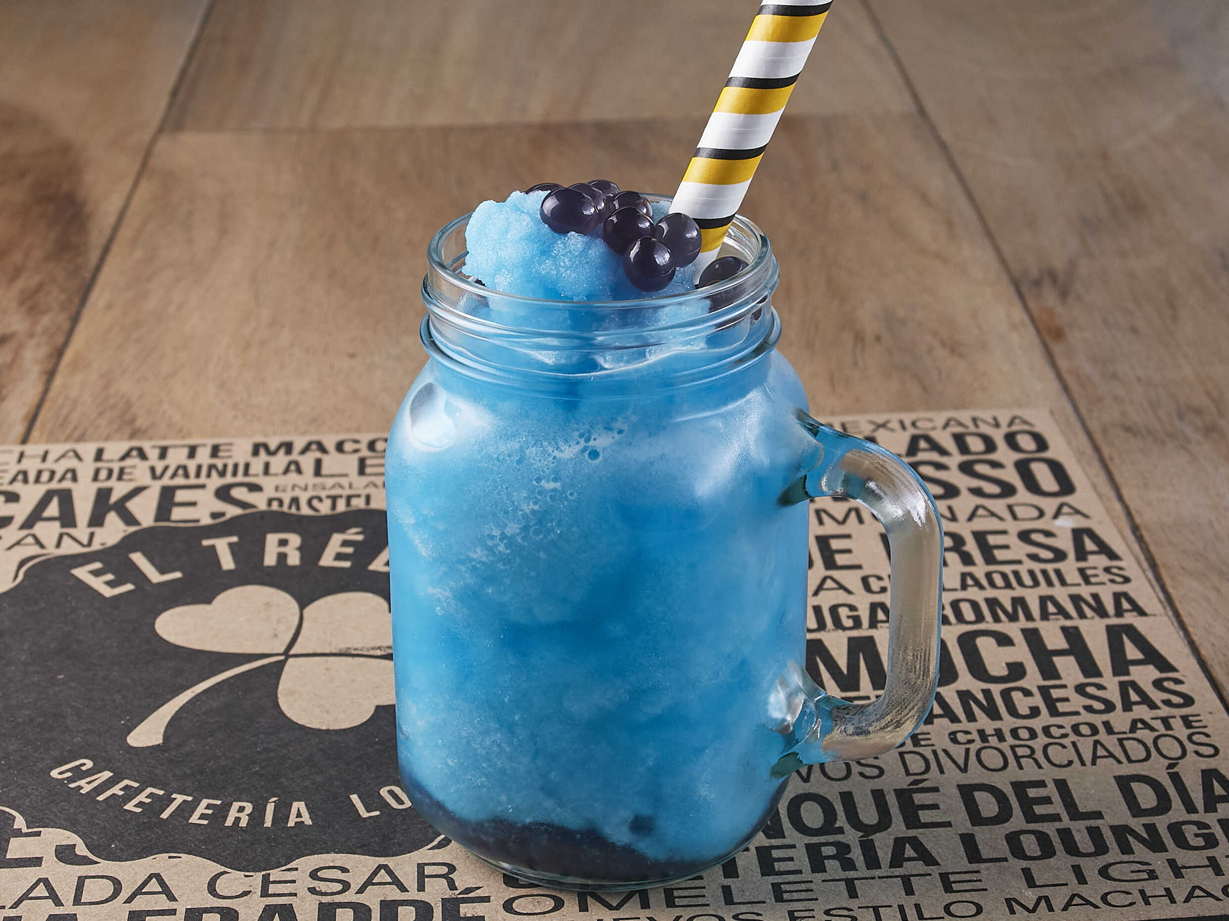 Batido de fruta con hielo, decorado con perlas explosivas.