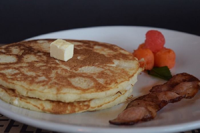 Hot cakes, huevos y jamón con tocino y perlas de fruta.