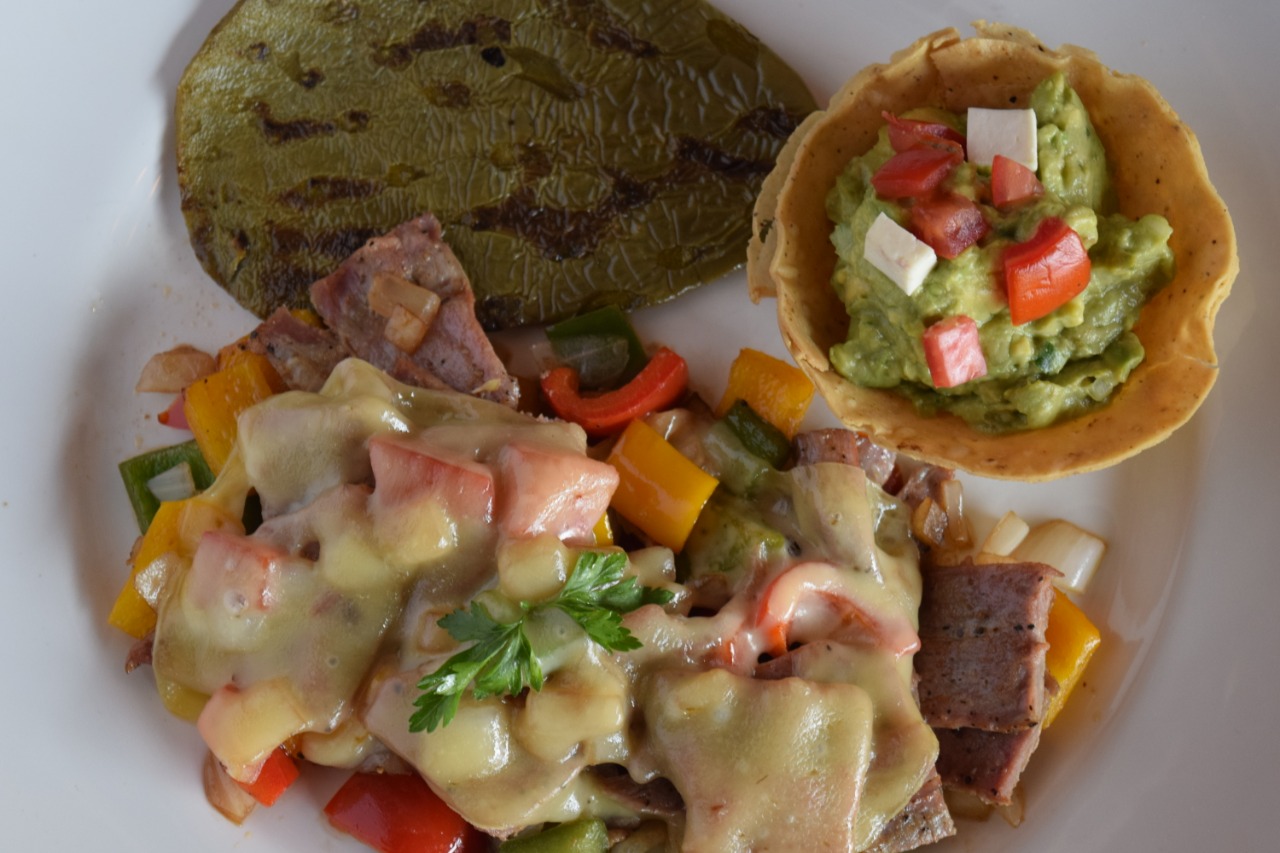 Queso crema, arrachera marinada, hierbas finas, queso tipo manchego gratinado, guacamole y cebolla.