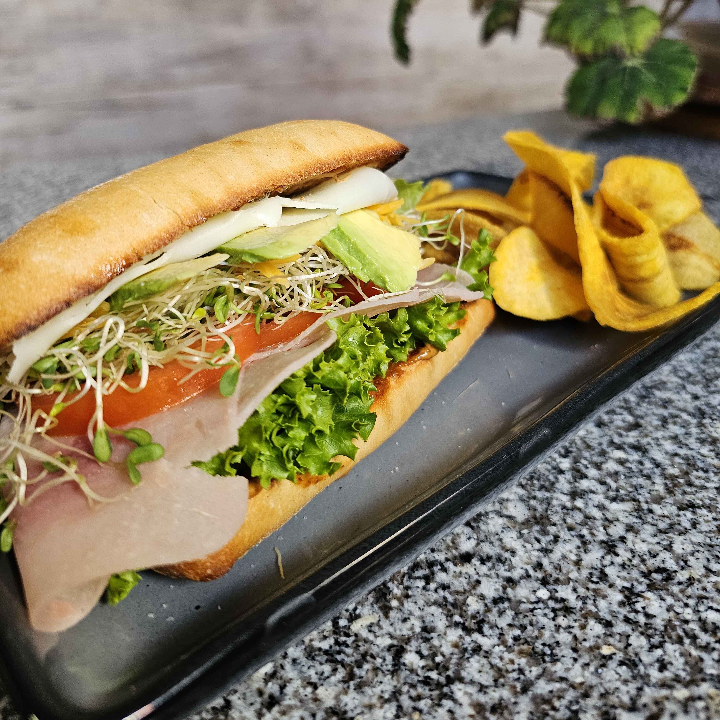 MAYONESA DE LA CASA, LECHUGA, JAMON PAVO, JITOMATE, GERMEN, QUESO CHEDAR, AGUACATE, QUESO MANCHEGO, ACOMPAÑADO DE FRITURAS.