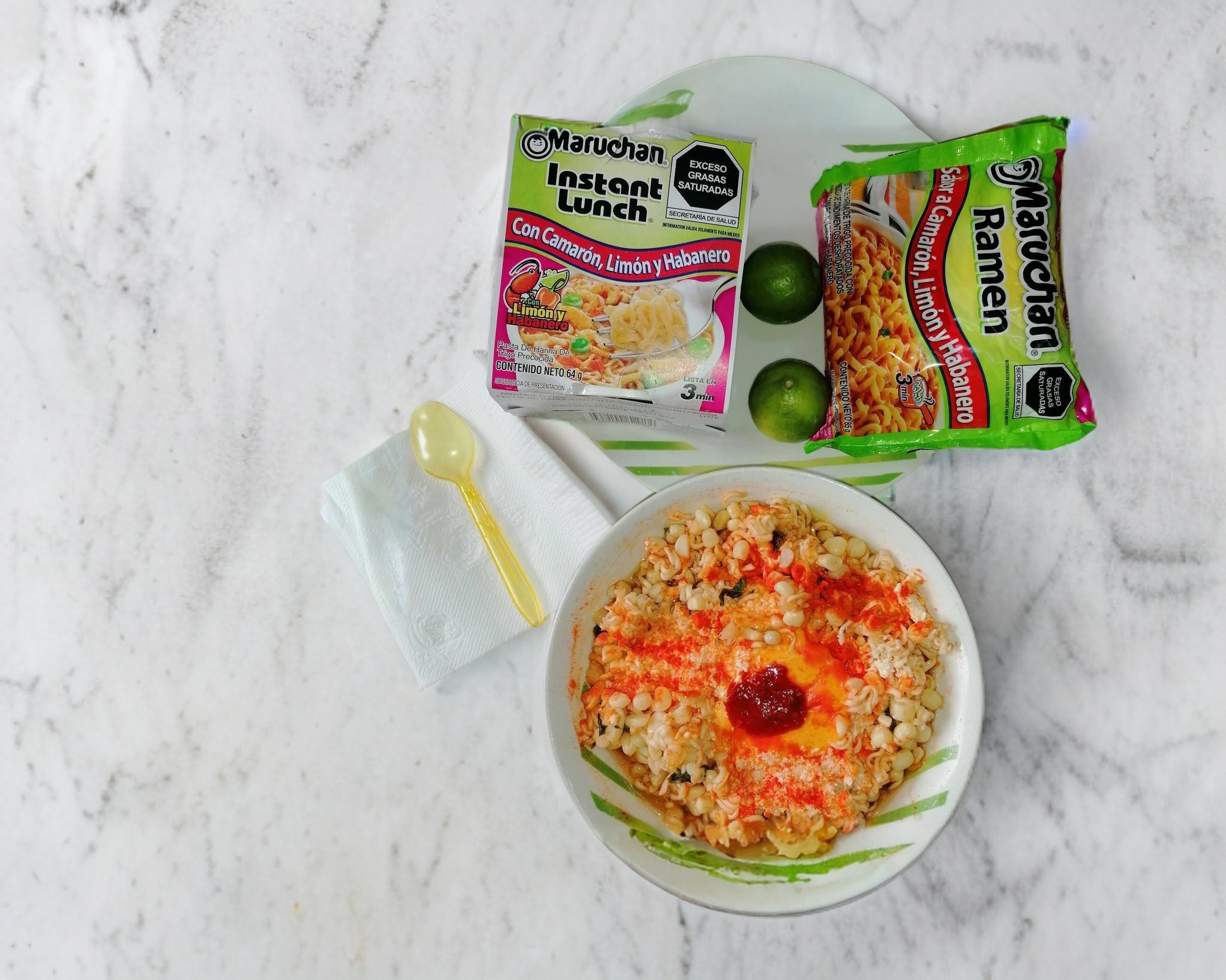 Elige ramen 85 gr vaso 65 gr, sopa con camarón limón y habanero y esquite hirviendo con maíz tierno, mayonesa, 3 quesos y 4 picantes por separado 100% deliciosa, producto no nutritivo.