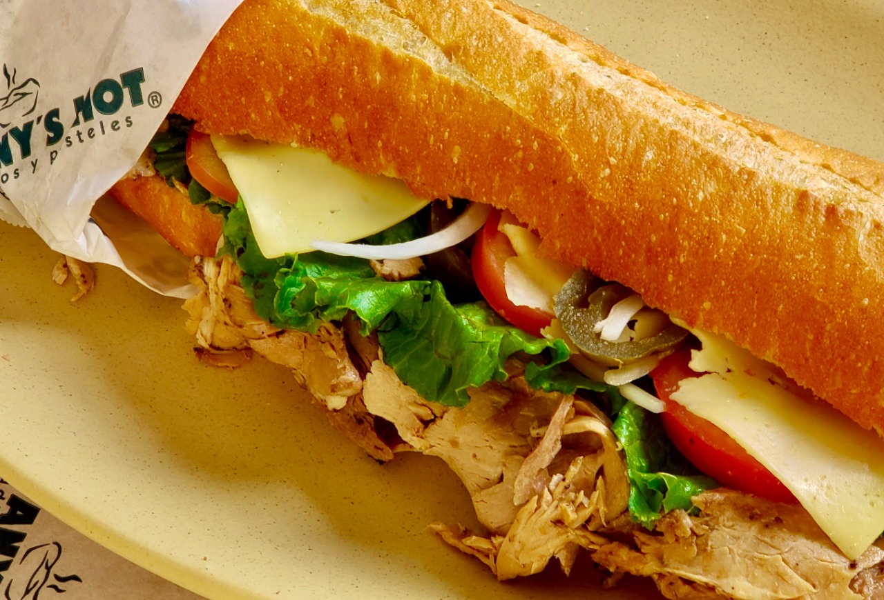 320gr y 25cm. Pierna horneada, lechuga italiana, jitomate, cebolla, queso manchego, aguacate, picante y aderezo.