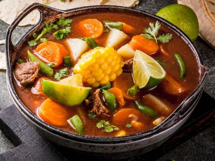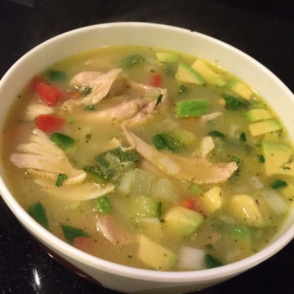 servida con julianas de tortilla frita , aguacate,queso panela,chicharrón, crema y chile pasilla.