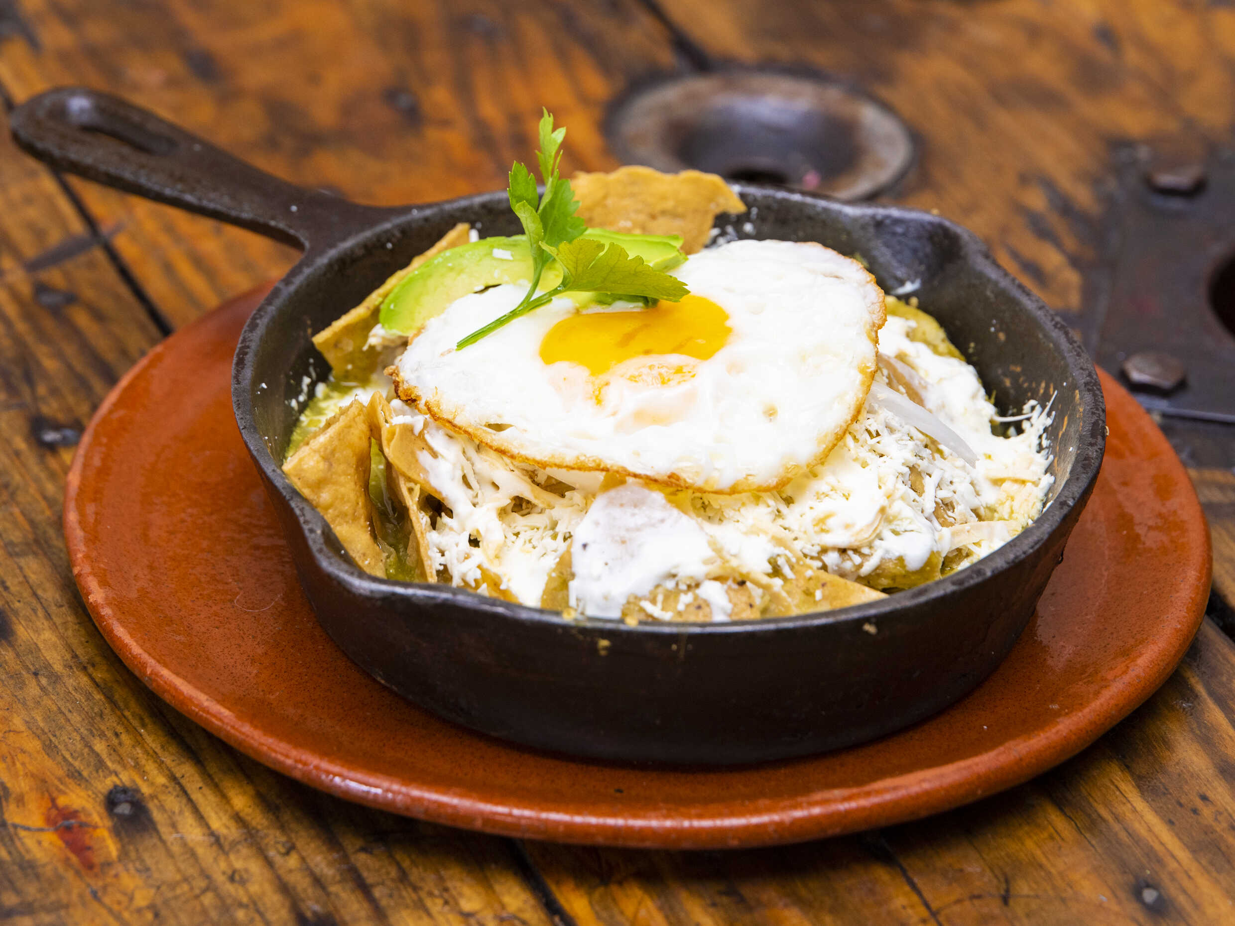 Con pollo deshebrado, queso, crema, aguacate y un huevo estrellado. Salsa verde o salsa roja.
