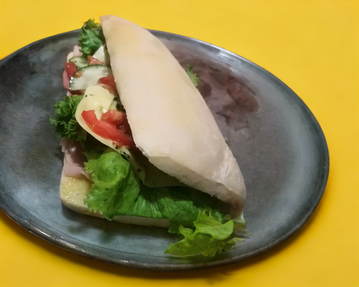 Jamón, salami, queso gouda, lechuga, pepino y jitomate.