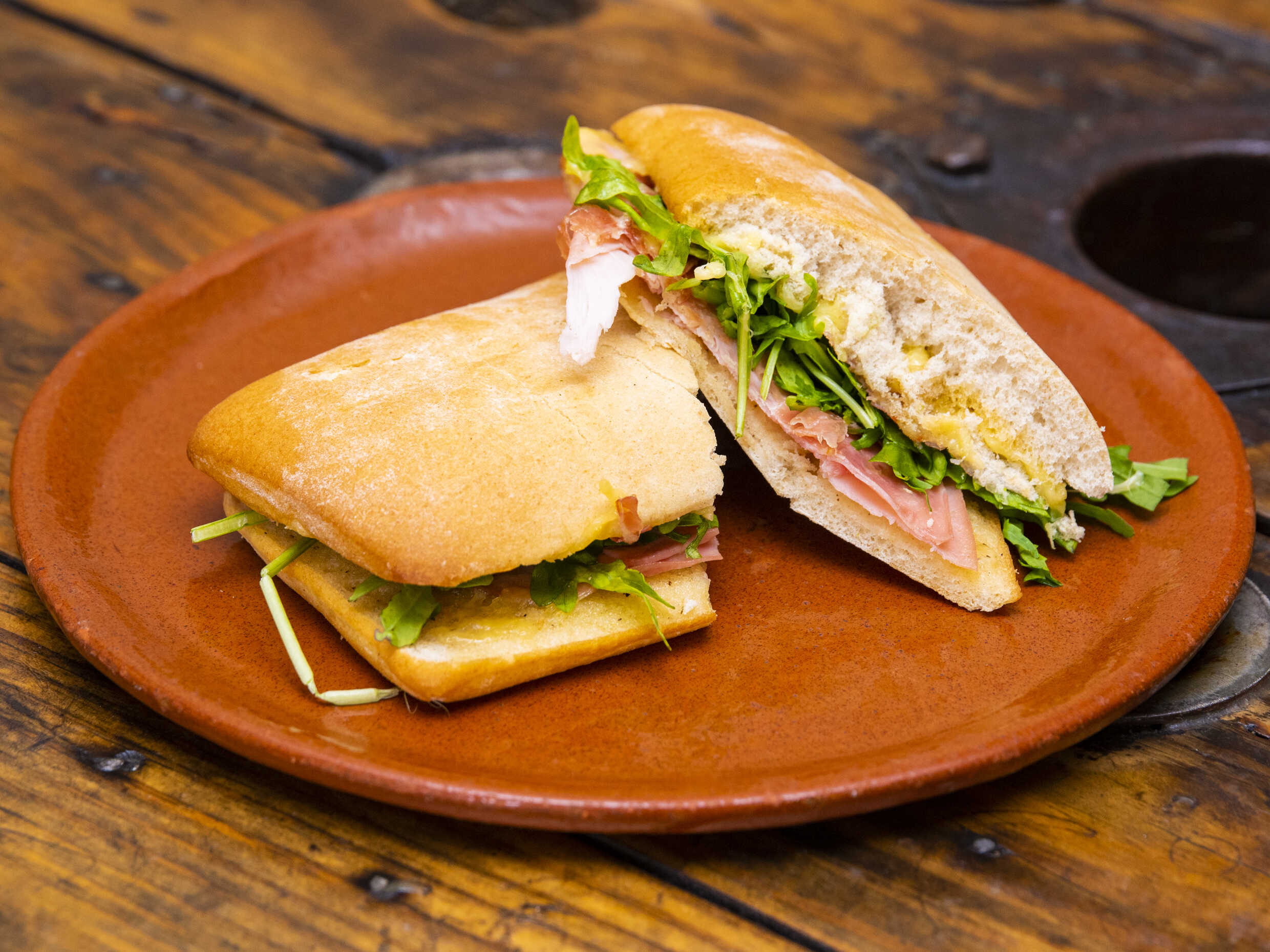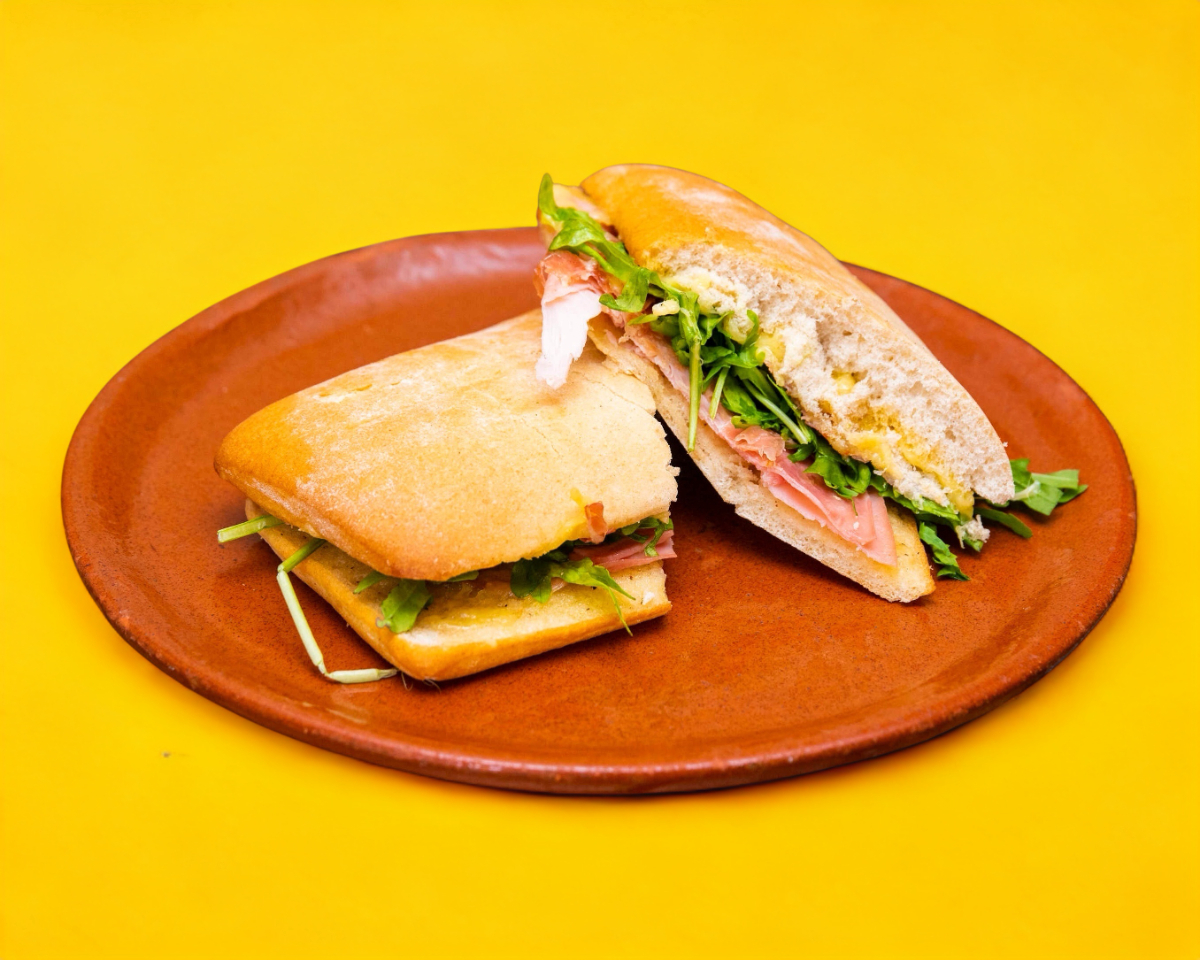 Jamón serrano, jamón ahumado, queso gouda, arúgula y jitomate deshidratado.