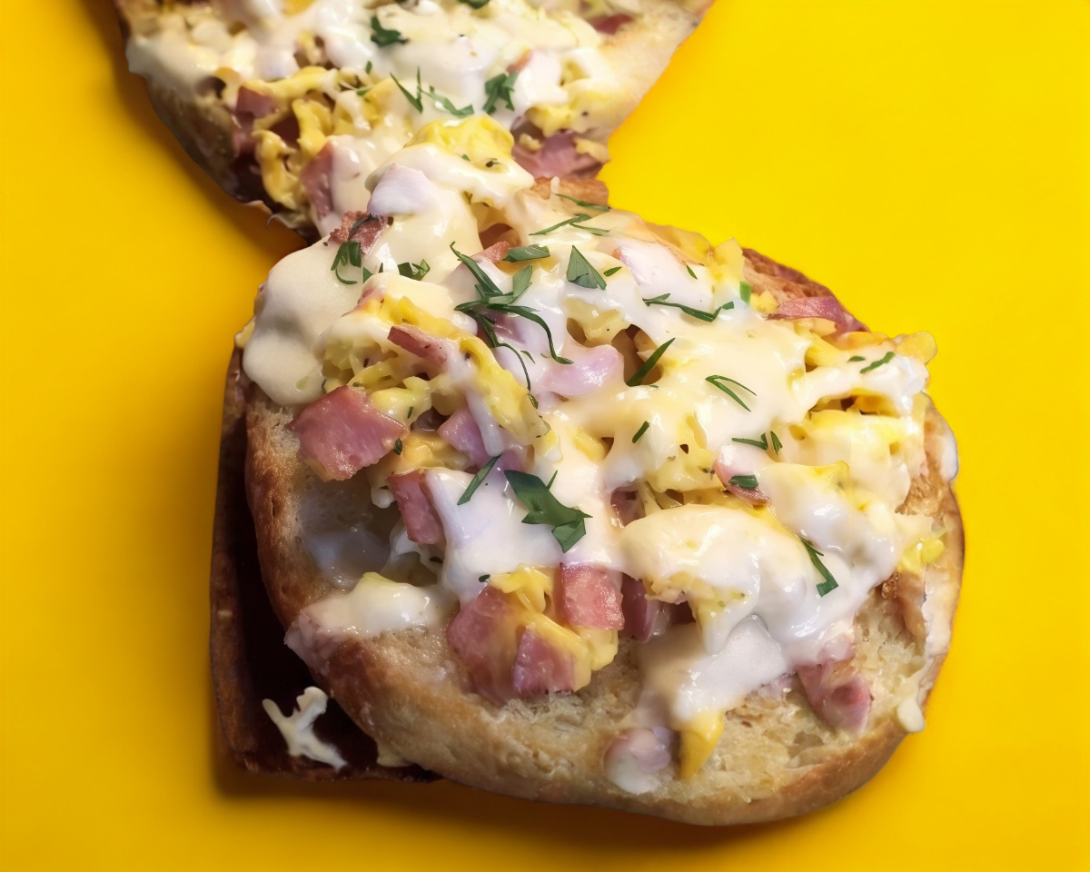 Relleno de huevo revuelto con tocino gratinado con queso gouda.