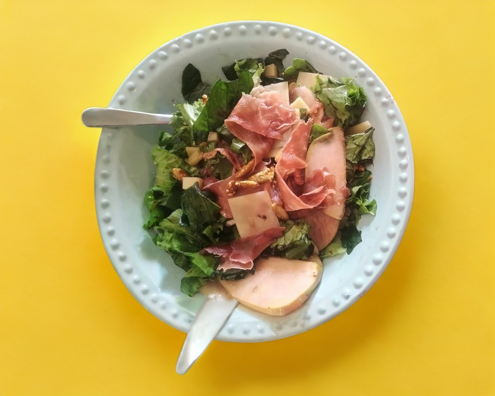 Jamón serrano, pera, queso parmesano, arúgula y aderezo de vino tinto. Base de lechuga y espinaca.