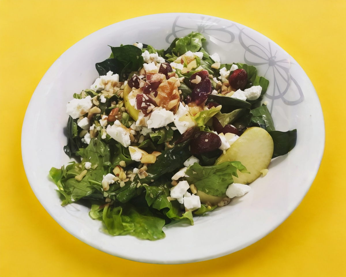 Manzana, queso de cabra, nuez, arándanos y vinagreta de miel y mostaza. Base lechuga y espinaca.