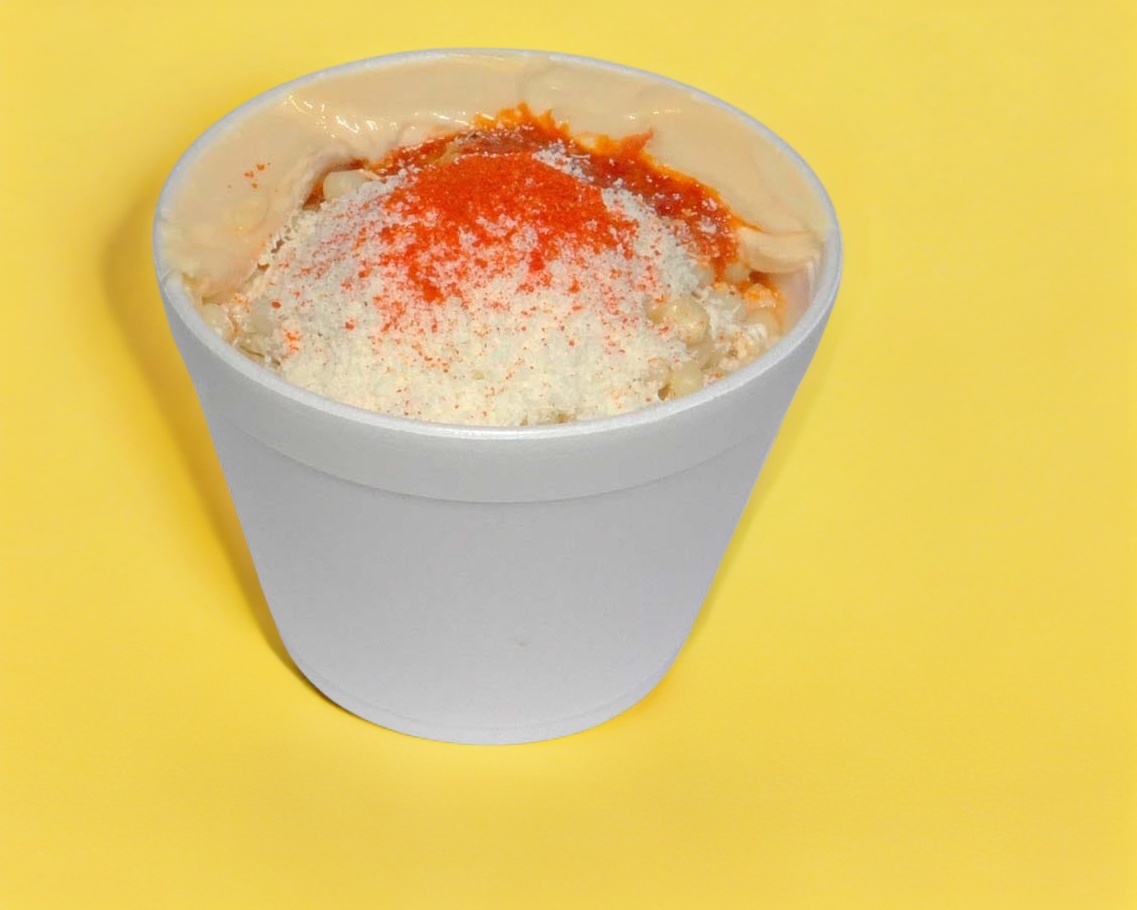 Delicioso Esquite Grande de 1/2 Litro( porcion personal ) caliente con limón, mayonesa, queso añejo rallado y picante ( a elegir)