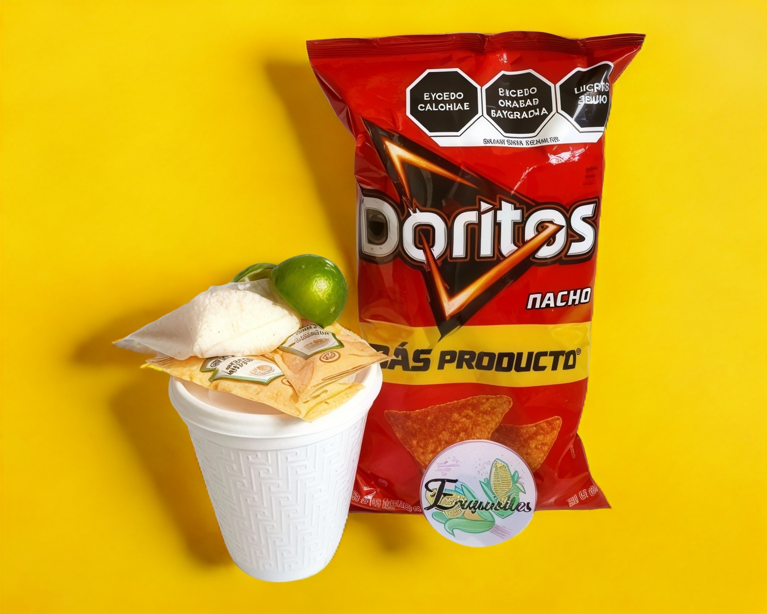Doritos nacho, granos de elote, limón, mayonesa, queso añejo rallado y picante (a elegir).