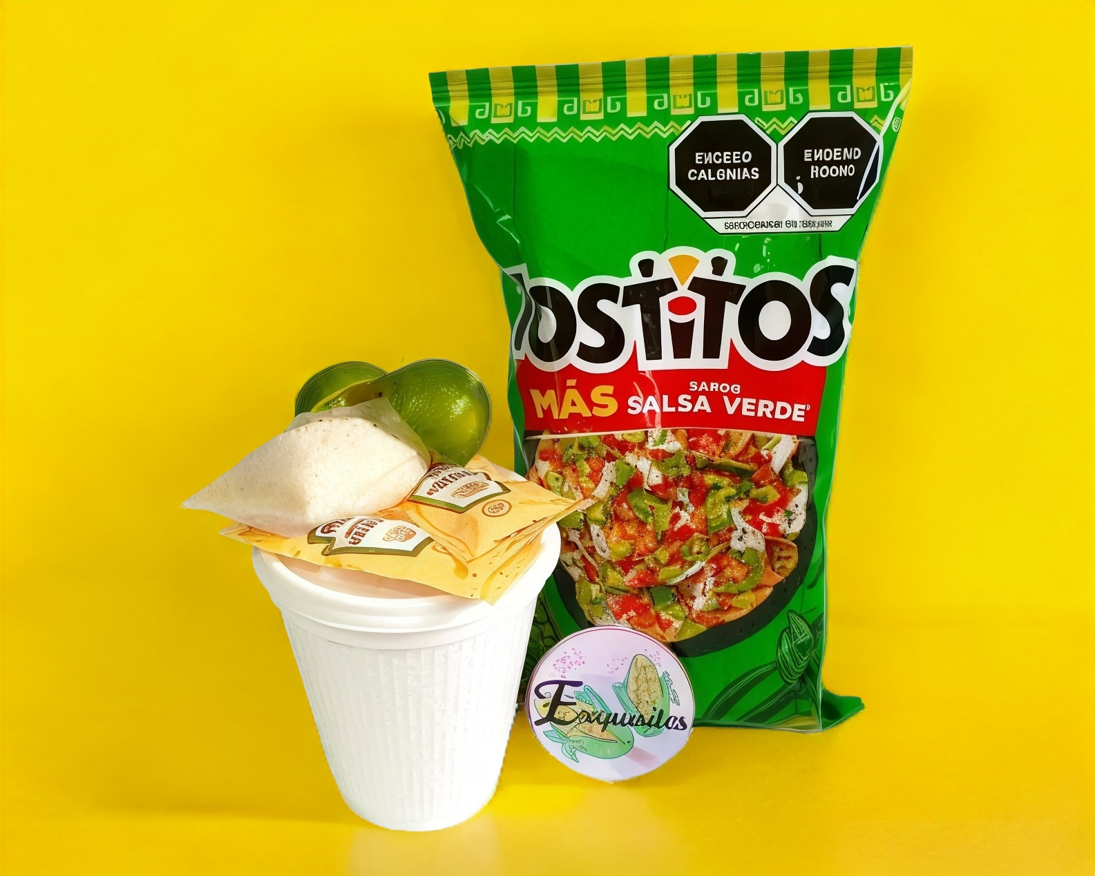 Tostitos salsa verde, granos de elote, limón, mayonesa, queso añejo rallado y picante (a elegir).
