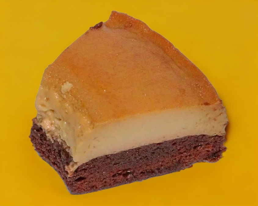 Deliciosa combinación de pastel de chocolate y flan de vainilla, reposado en caramelo líquido.