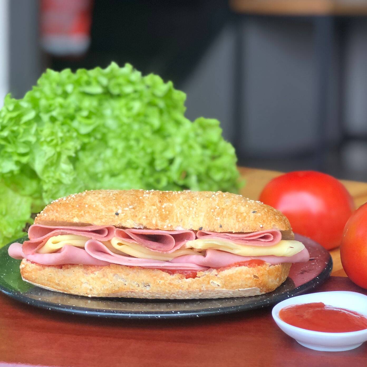 Pan integral, jamón de pavo, queso gouda, lechuga, jitomate y aderezo de jalapeño