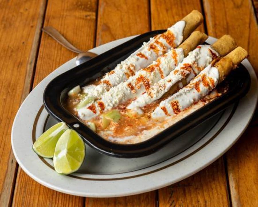 Flautas (4) ahogadas en consomé picante, con pepino, cebolla, crema, queso y salsa macha.