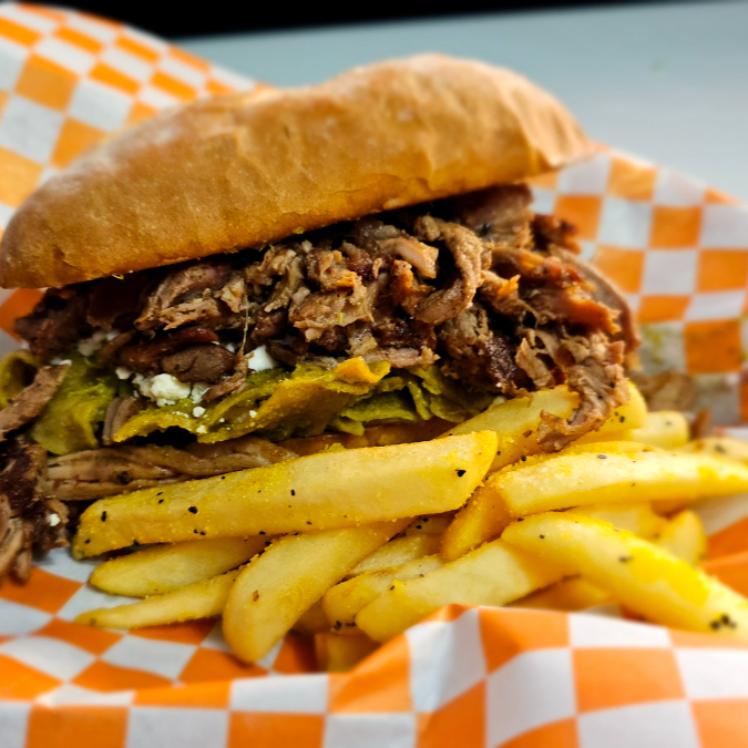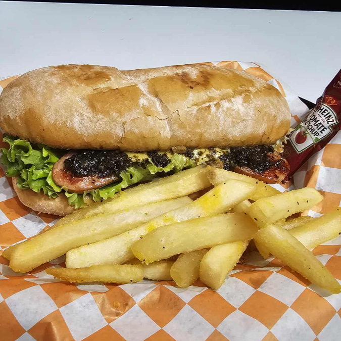 Baguette crujiente, carne de res, cebolla y pimiento morrón, queso