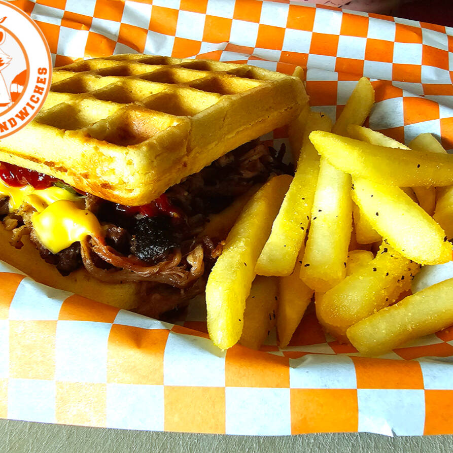 Waffles, pulled pork ahumado, queso americano, salsa BBQ y pepinillos.