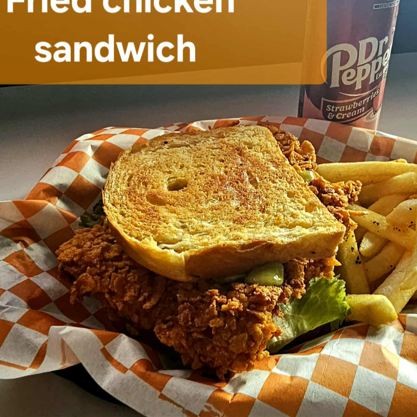 Pan brioche, pechuga de pollo empanizada, aderezo de tu elección, lechuga y pepinillos