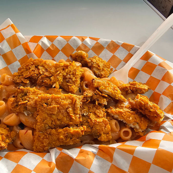 Mac & Chesse Con pollo frito.