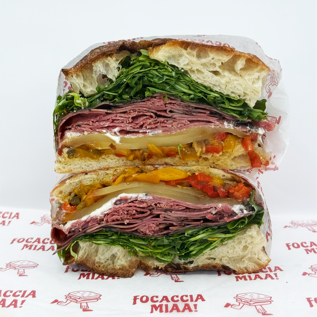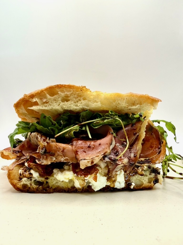Burrata, roast beef 100g queso provolone, pimientos salteados, crema de balsamico y arugula