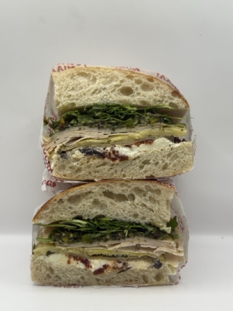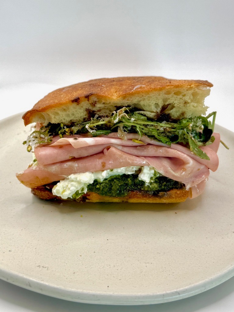 Burrata, Jamon de pavo al pesto, berenjena y calabaza asada, tomate deshidrato y arugula