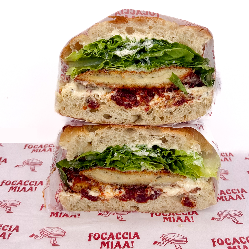 Pollo a la parmesanan (pechuga) crema de ajo rostizado, baby romana y tomate deshidratado