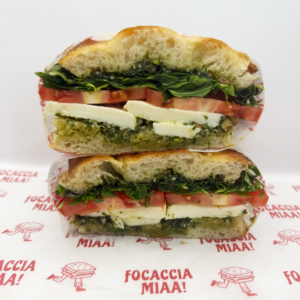 Mozzarella fresco, jitomate, pesto de pistache, arugula, queso parmesano y crema de balsamico