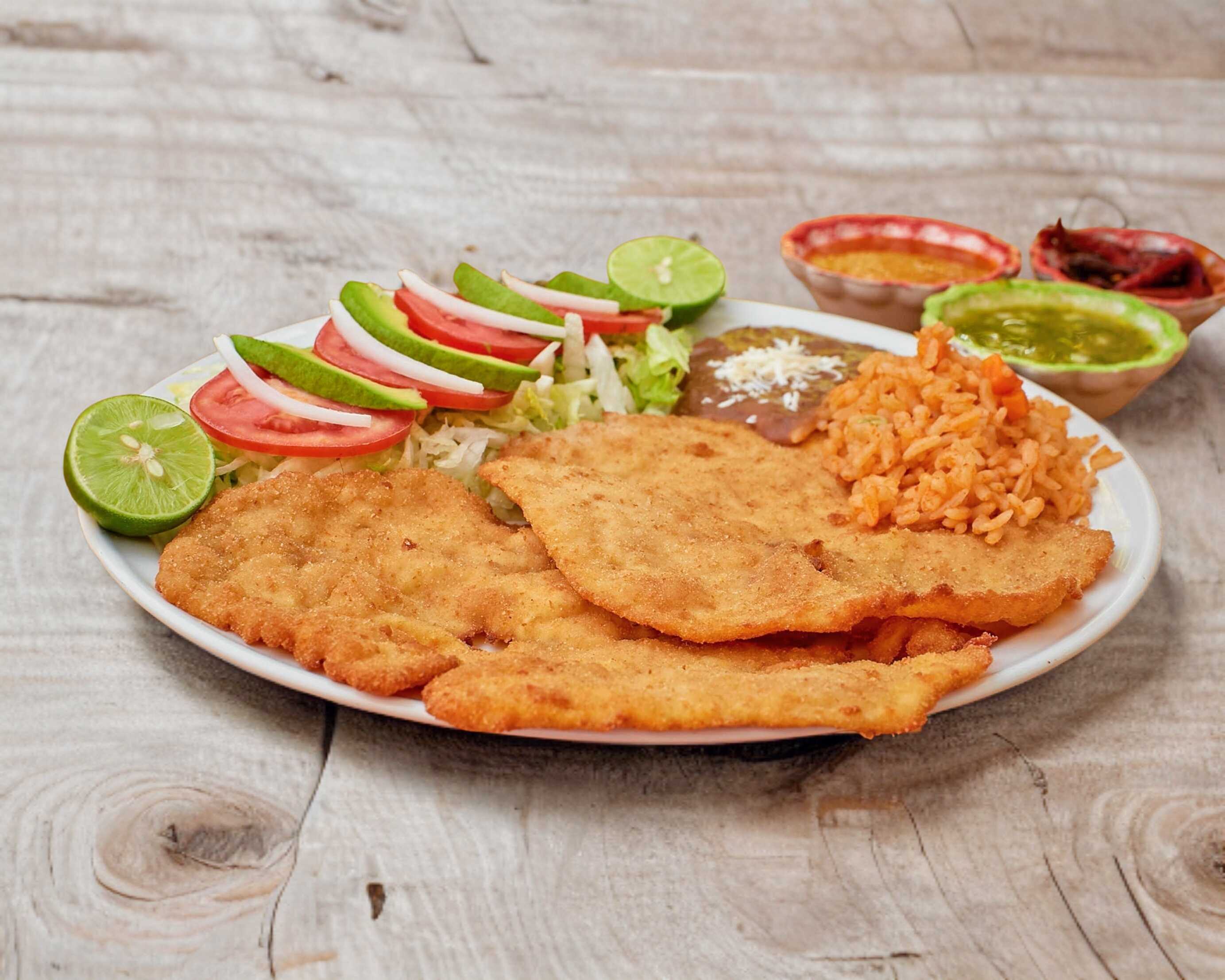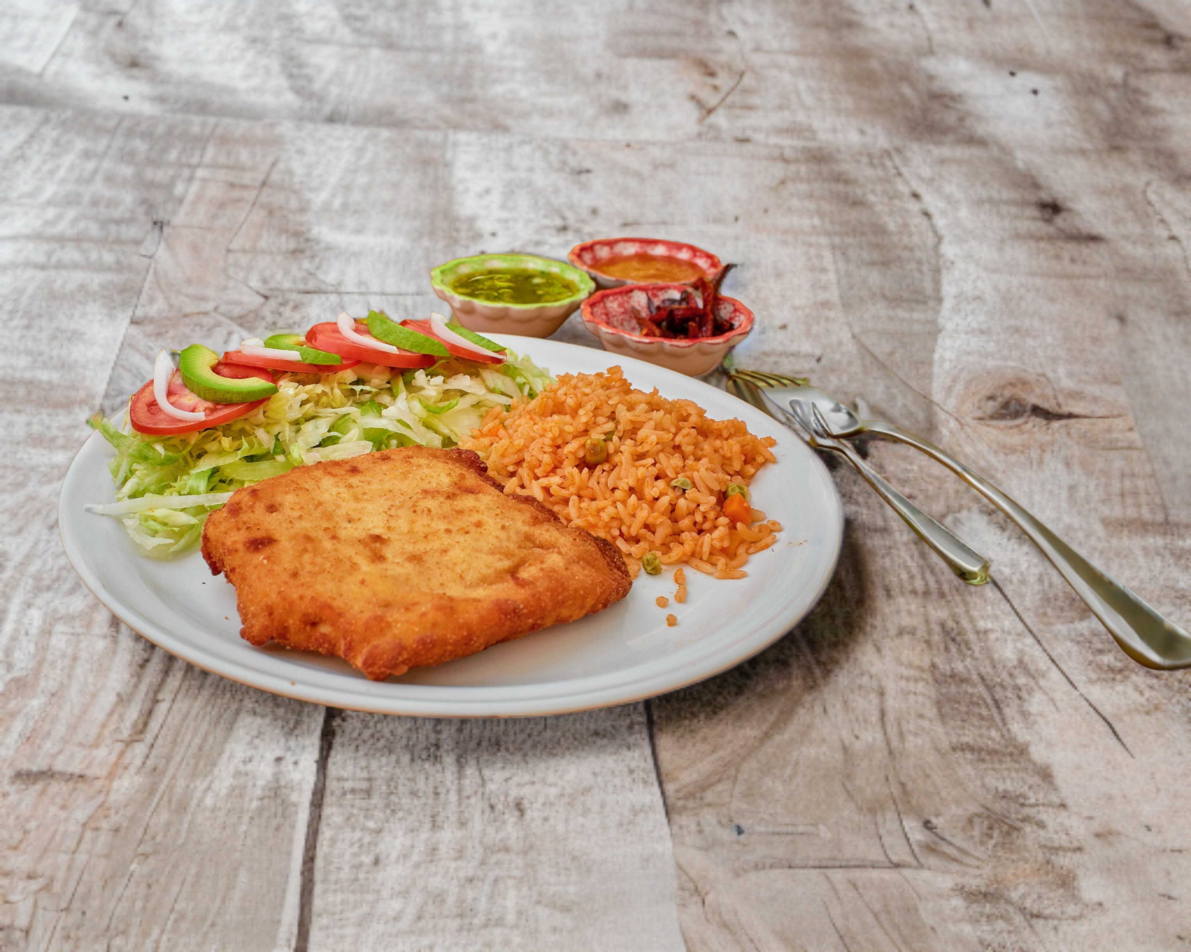 Acompañada con ensalada de lechuga, jitomate, aguacate, cebolla, arroz y frijoles refritos