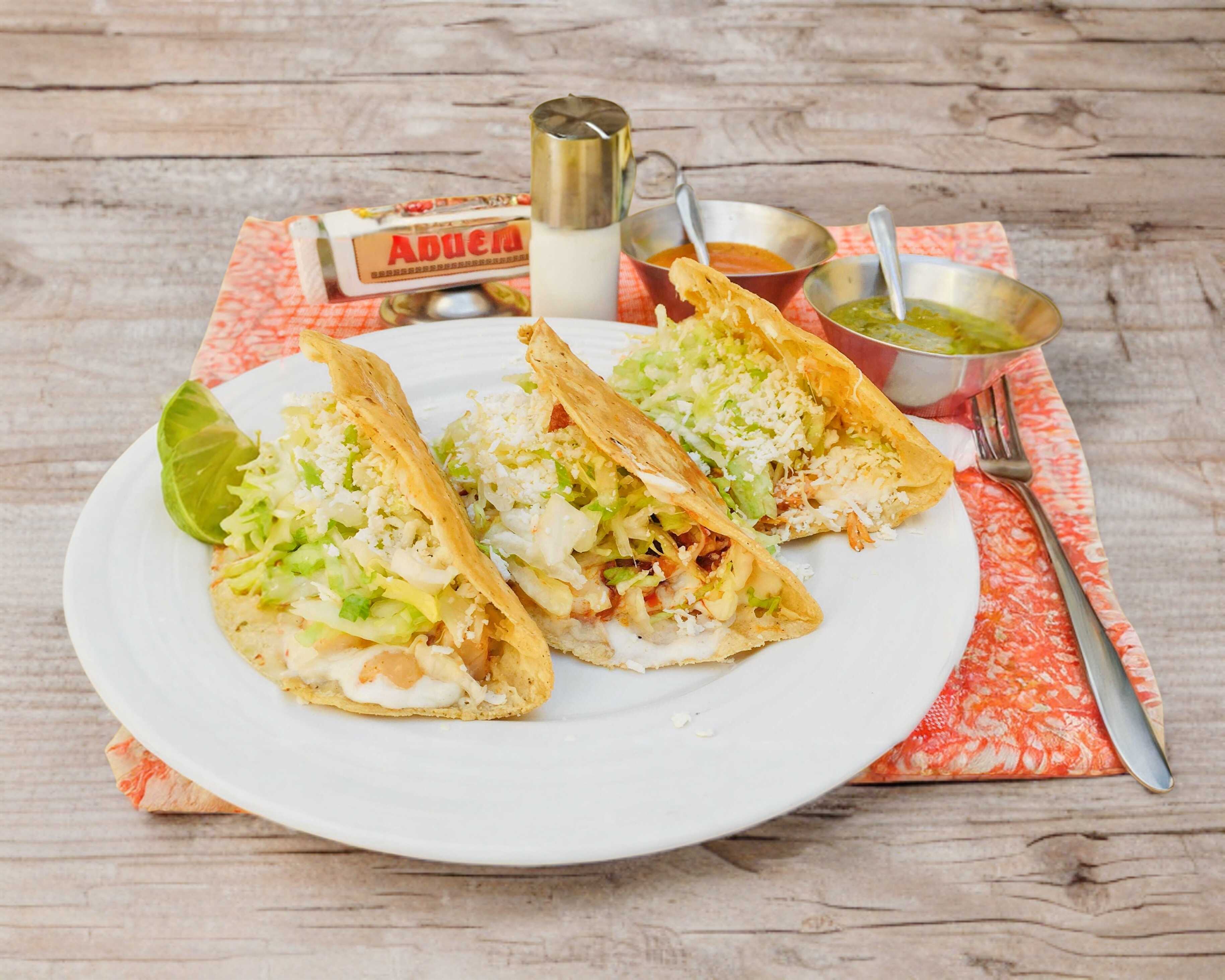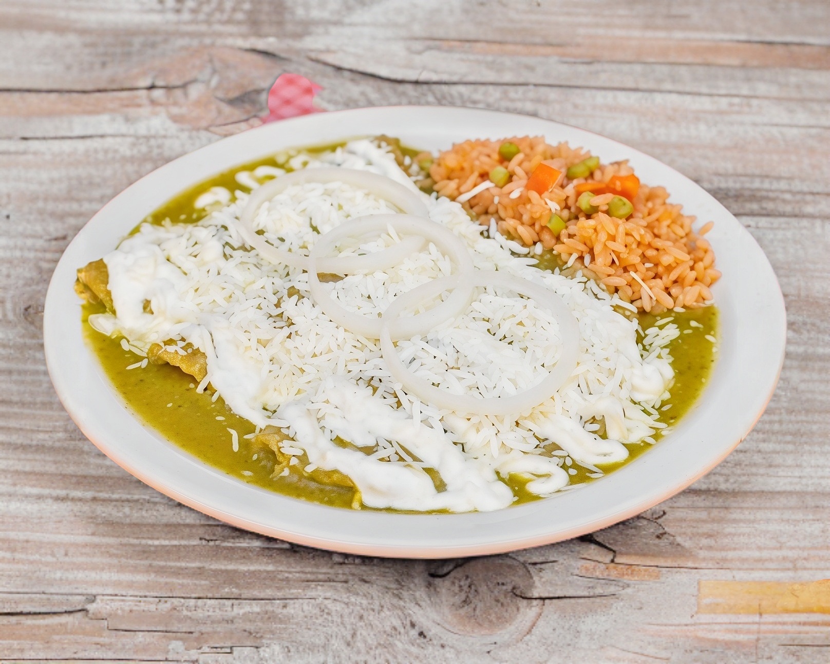 Tortilla frita rellena de pollo, bañadas en salsa verde, roja o mole poblano, decoradas con crema, queso, cebolla y arroz