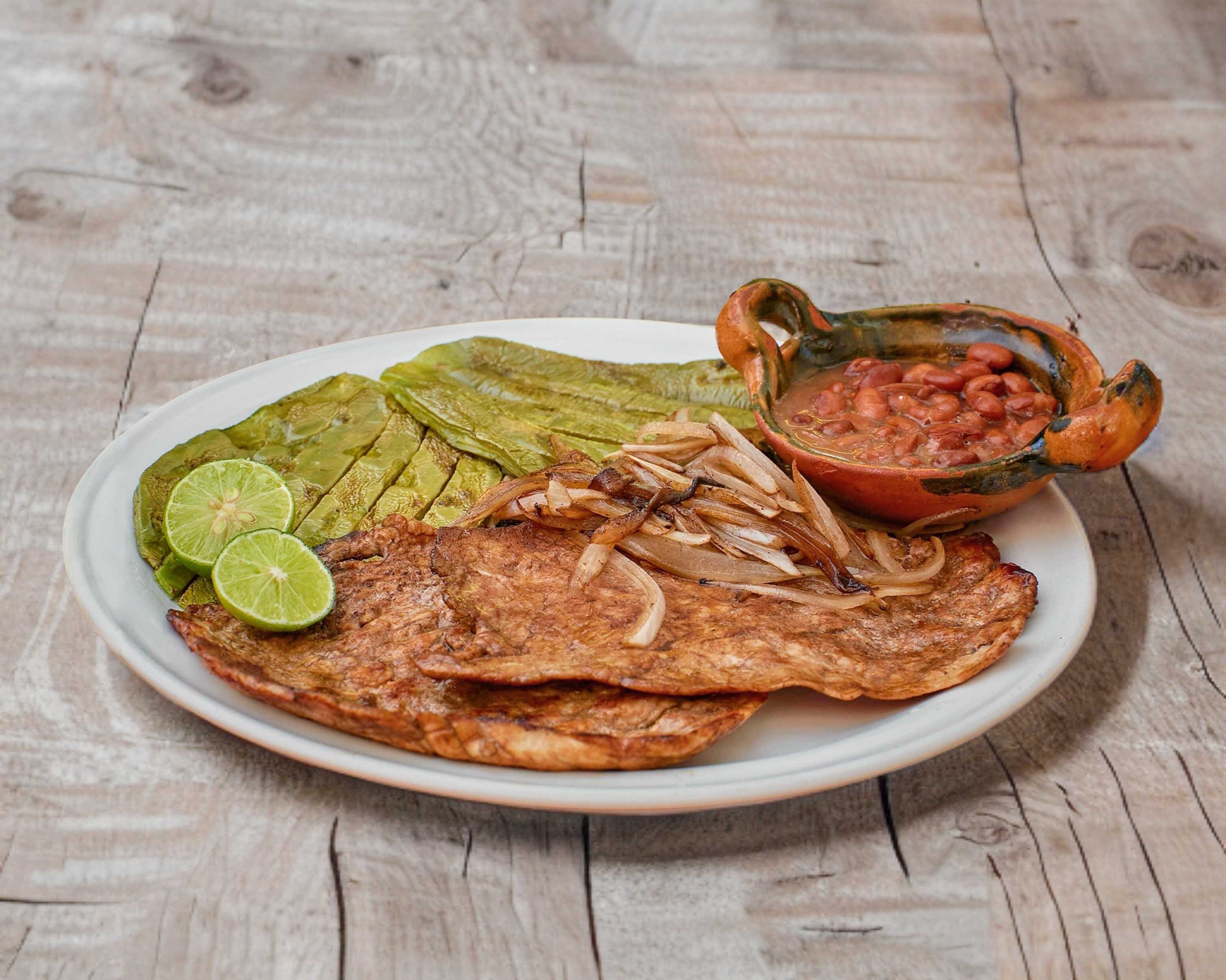 Bistec de puerco asado, acompañado de nopal asado, cebollitas asadas, guacamole y tortillas