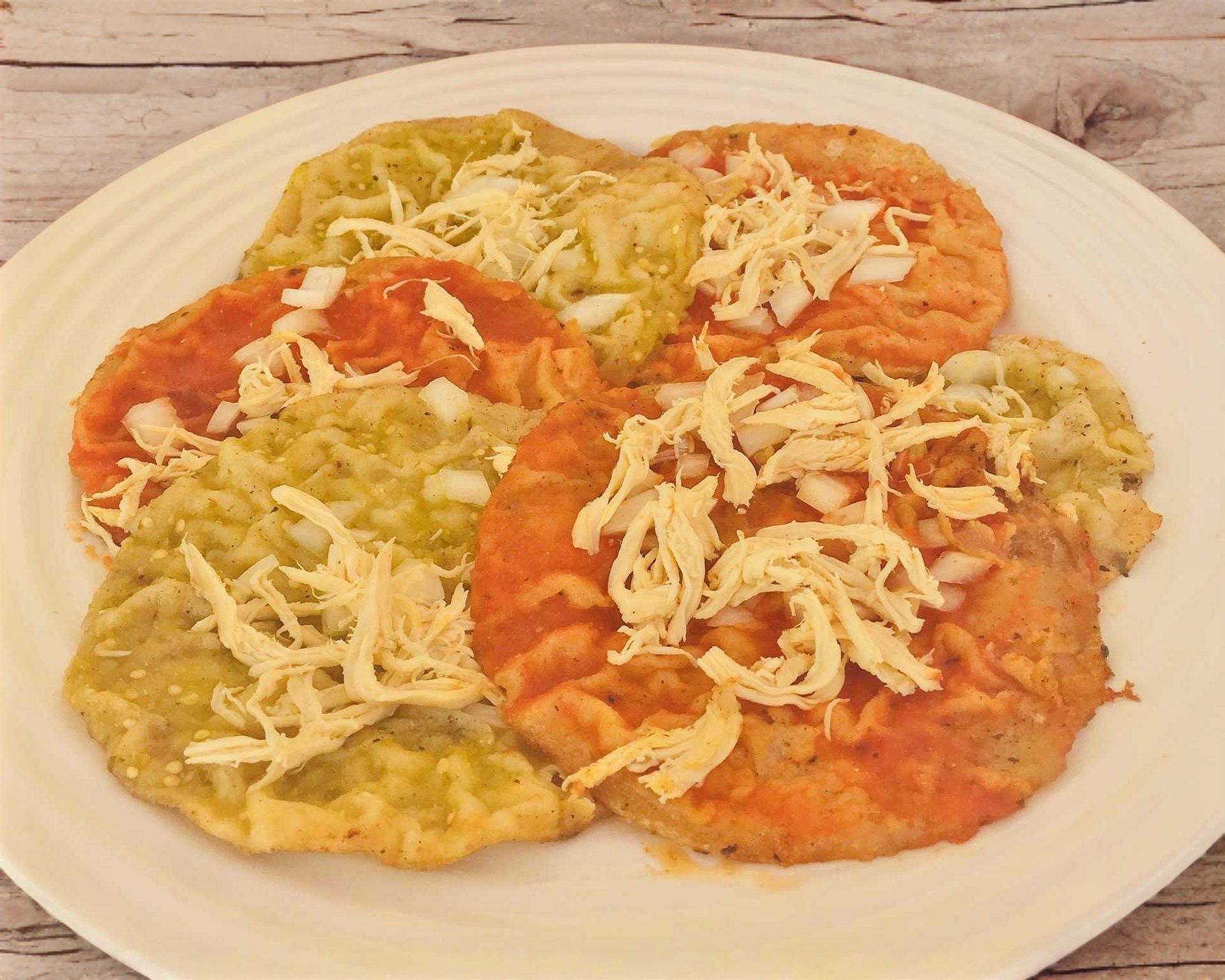 Bañadas en salsa verde o roja, decoradas con cebolla