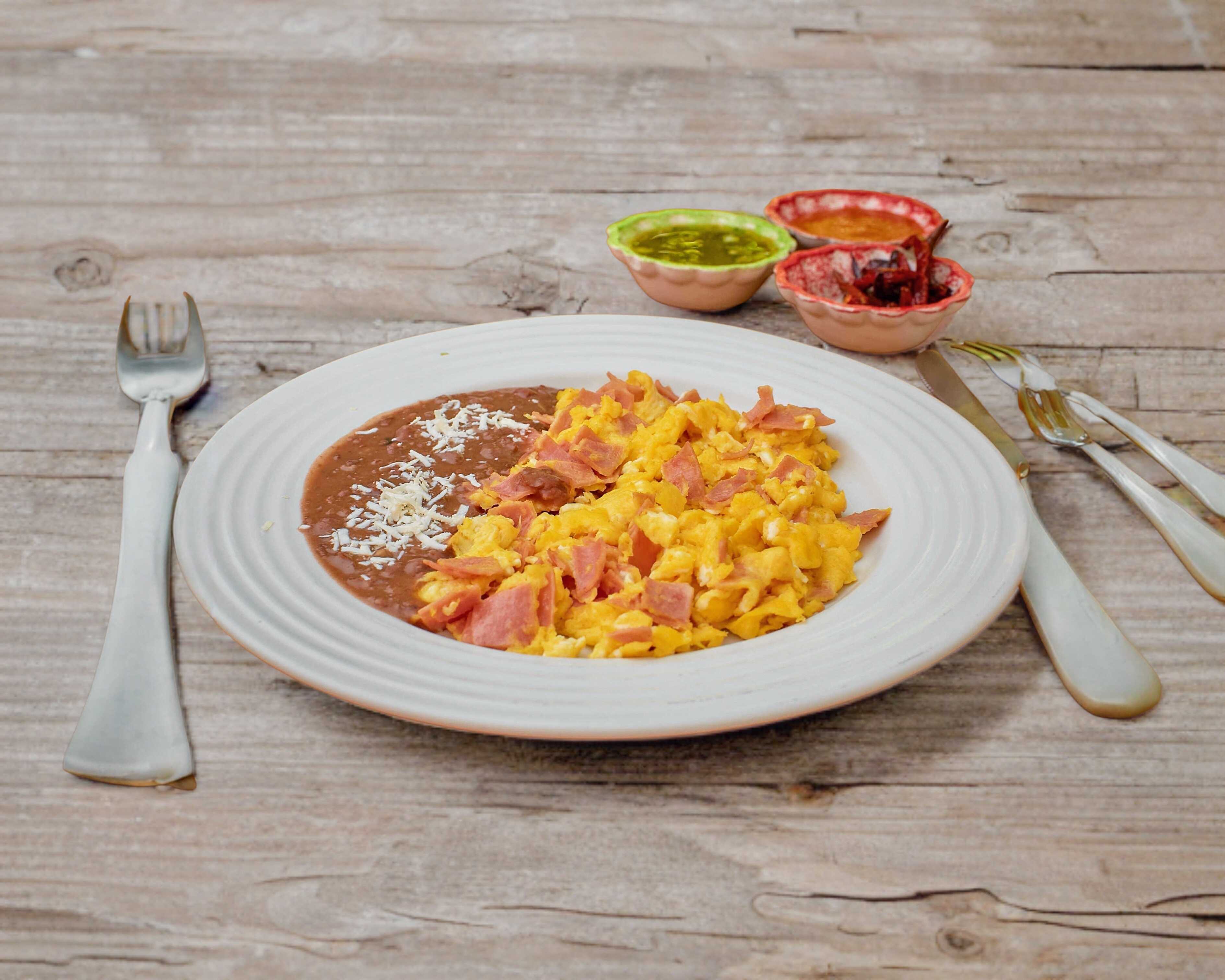 Huevos revueltos, acompañados con frijoles refritos y queso