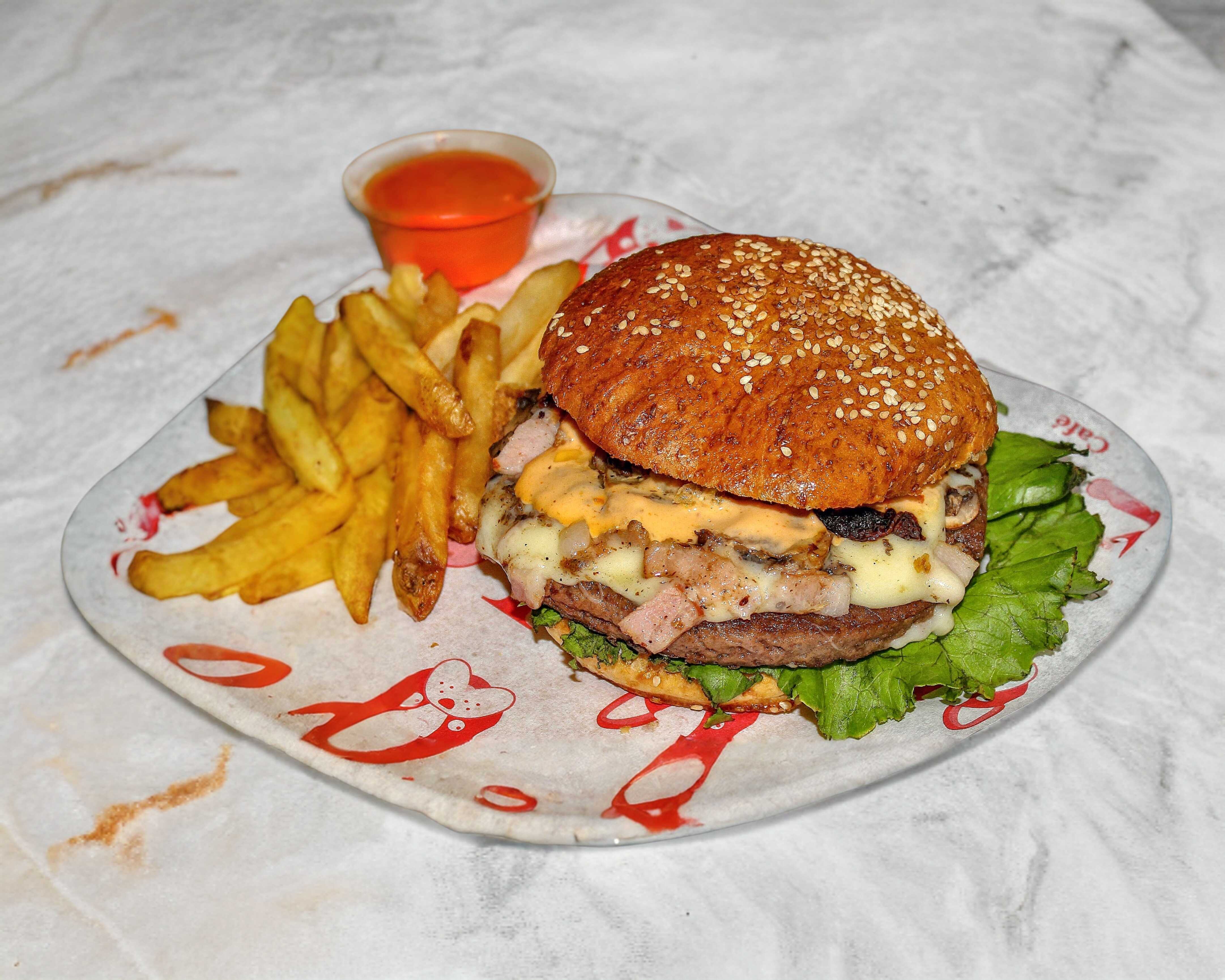 150 gr de jugosa carne de sirloin, tocino, champiñones, queso y aderezo habanero-ranch.