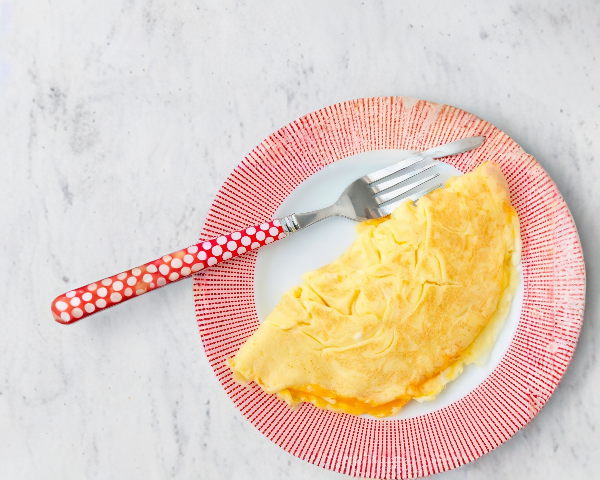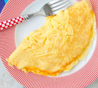 2 Piezas de huevo con queso acompañados de frijoles refritos y pan tostado.