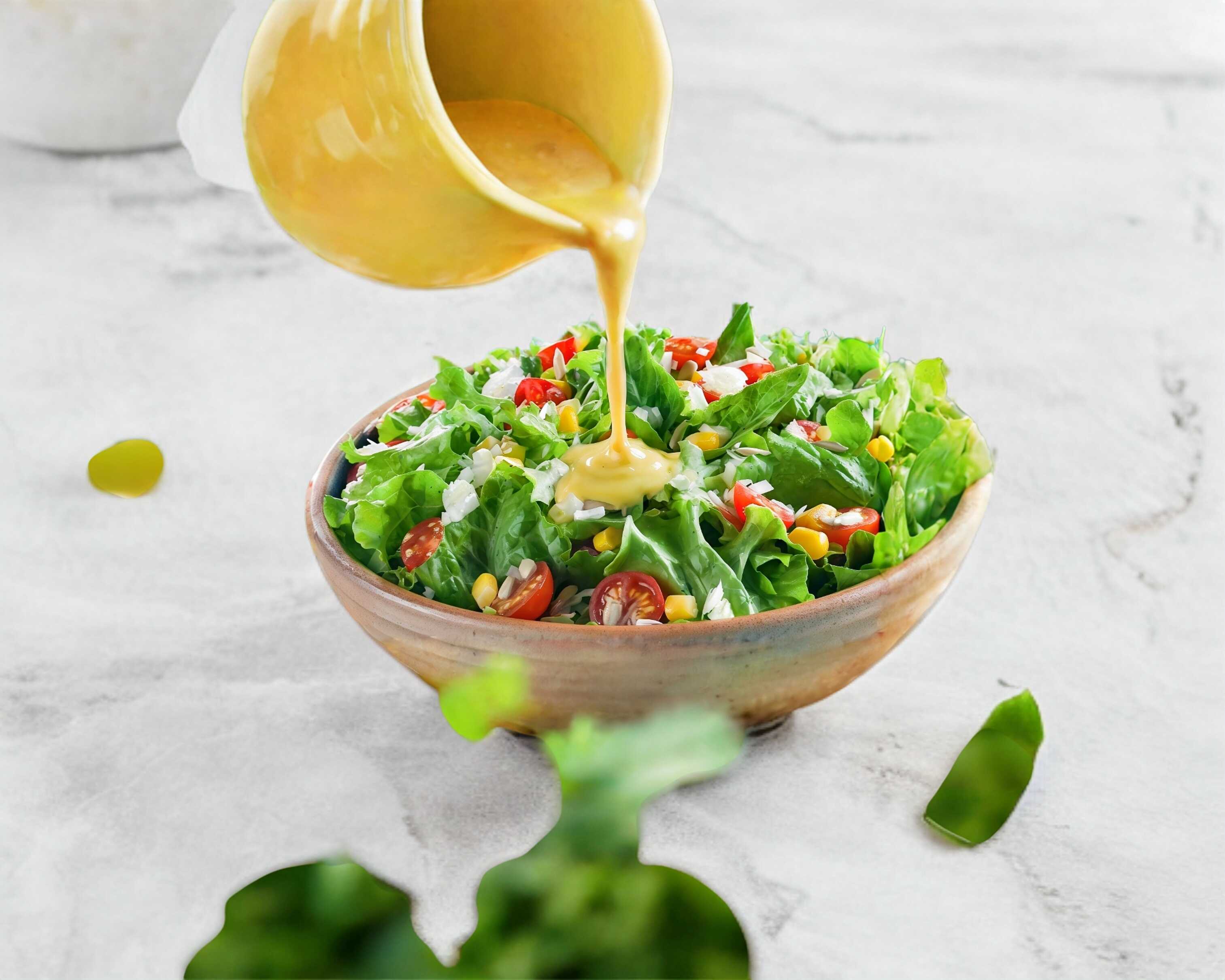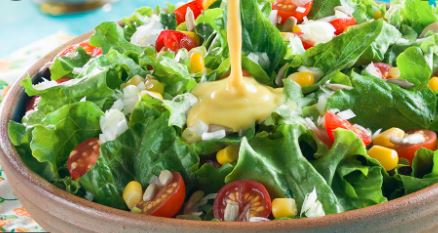 Con aderezo parmesano, lechuga, jitomate, pepino y zanahoria.