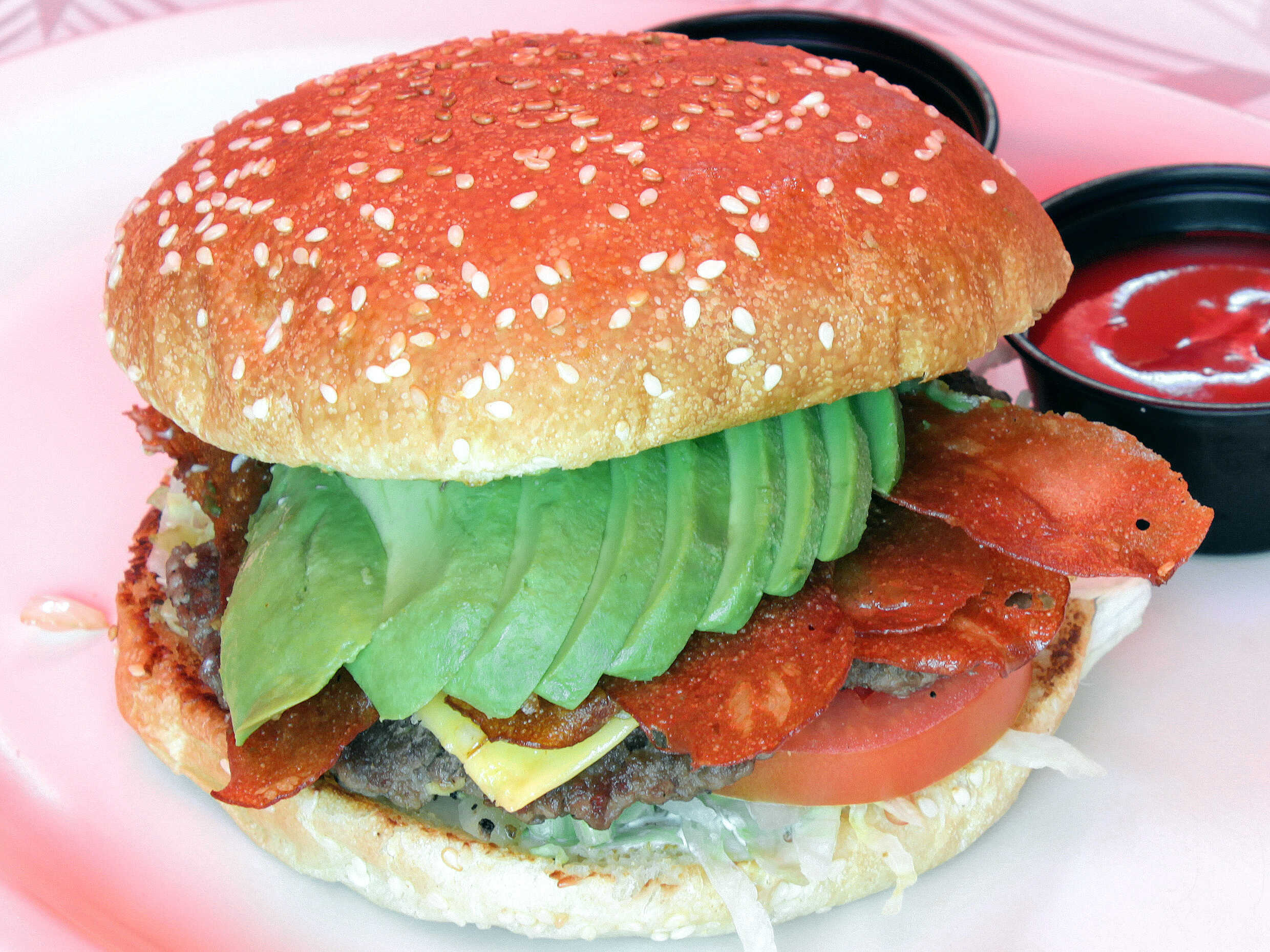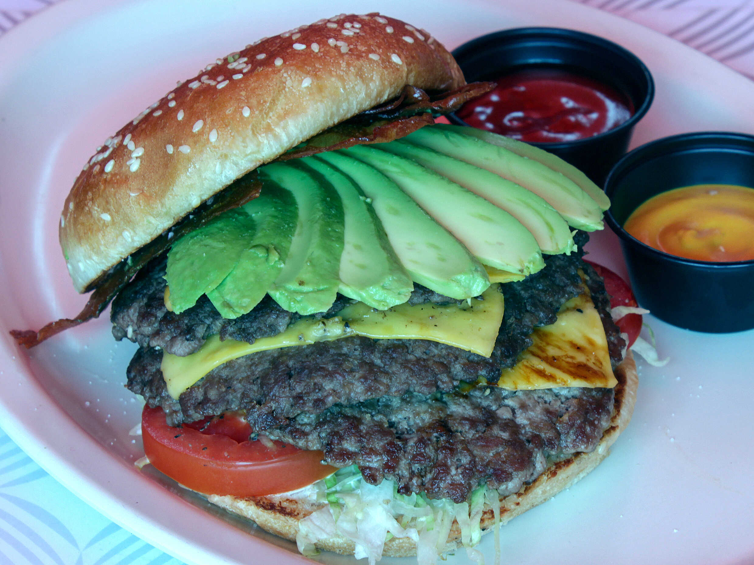 Triple carne 100% de res, triple queso, tocino, aguacate, lechuga, jitomate, cebolla caramelizada, mayonesa servida en un pan grande de hamburguesas.