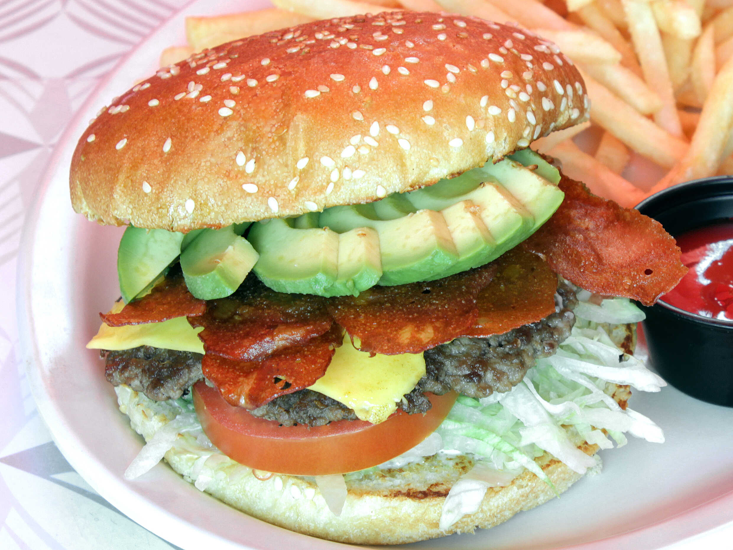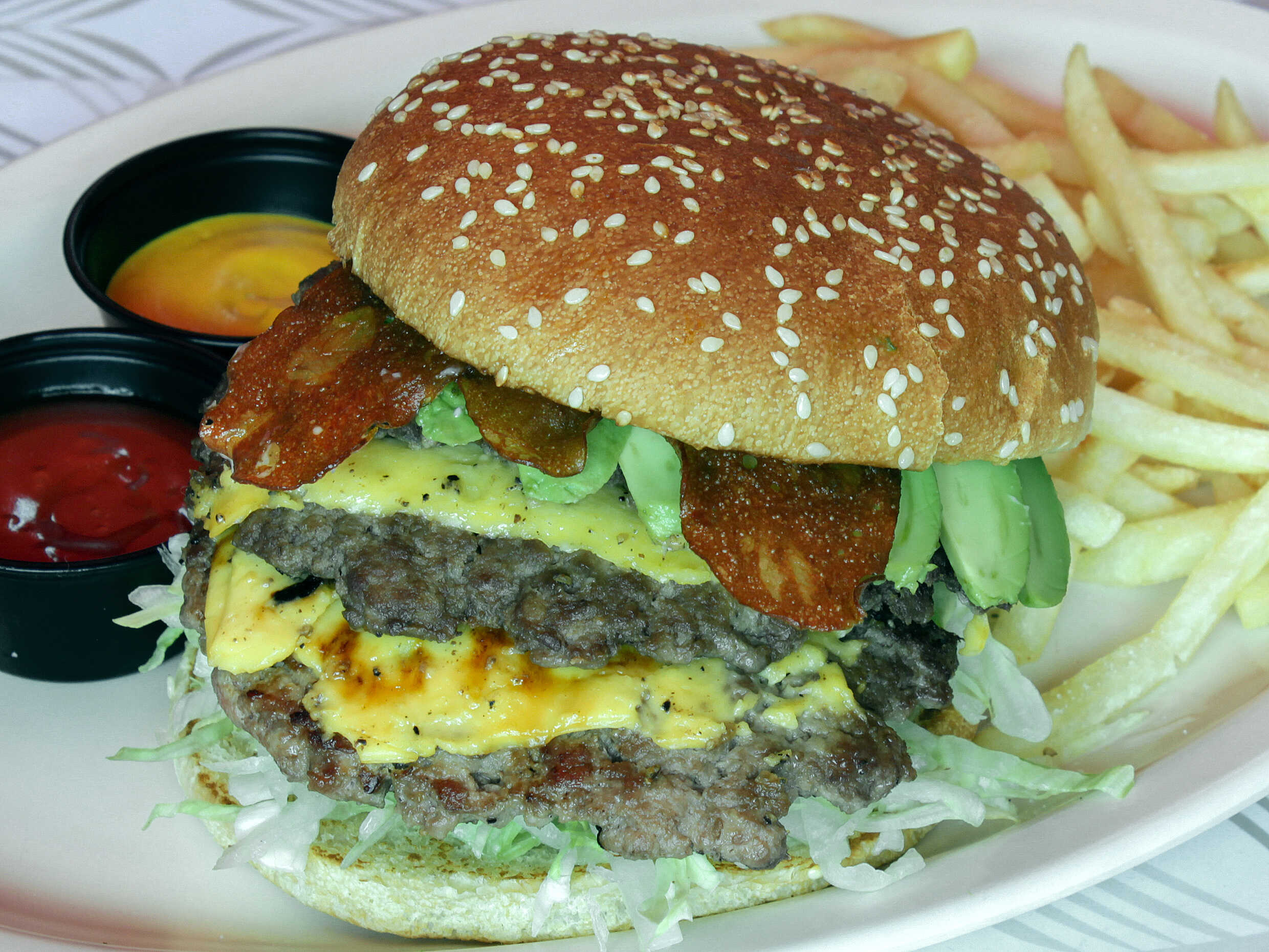 Triple carne 100% de res, triple queso, tocino, aguacate, lechuga, jitomate, cebolla caramelizada, mayonesa servida en un pan grande de hamburguesas acompañada de una porción de papas fritas.
