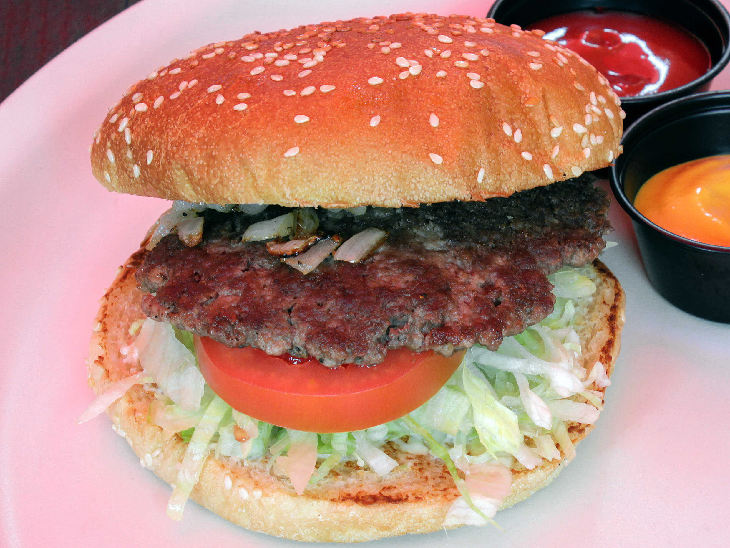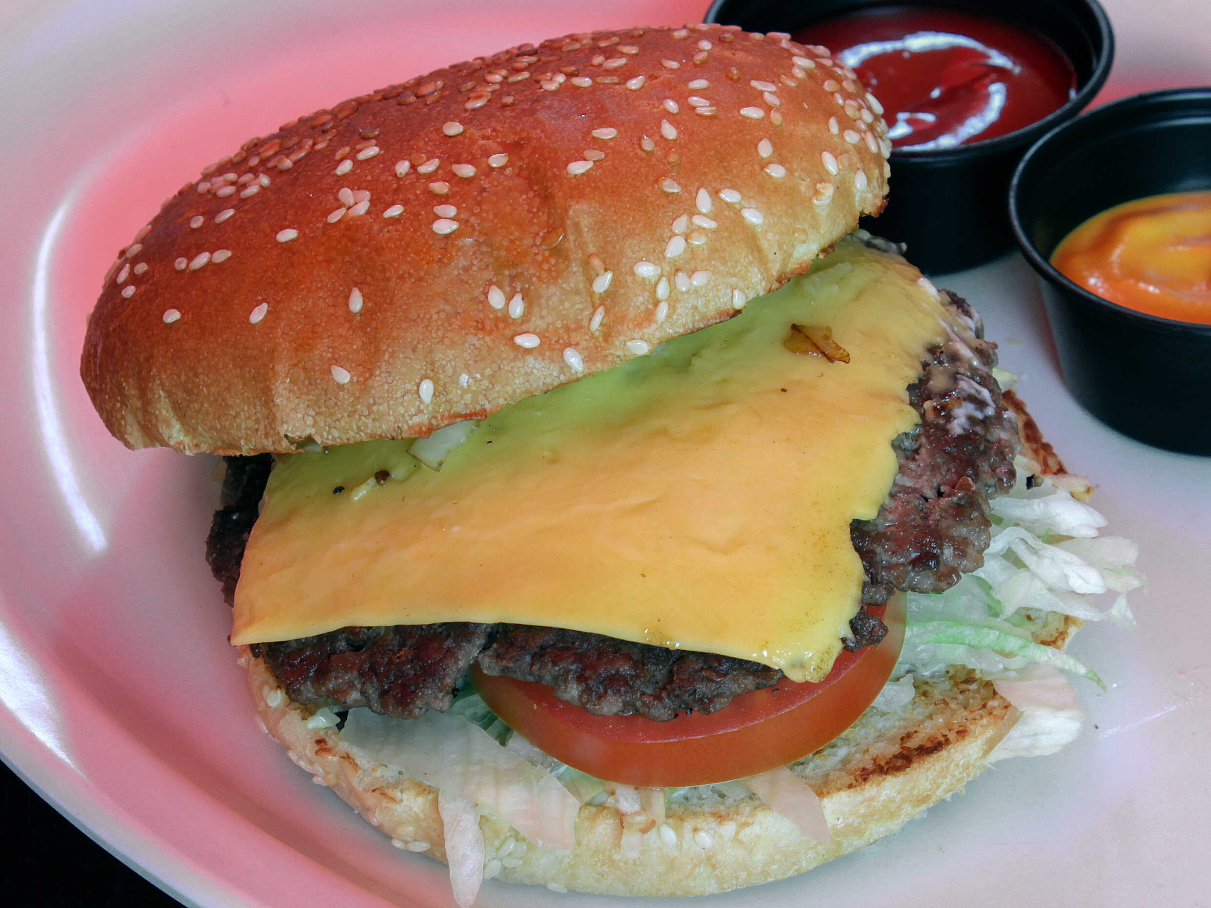 Carne 100% de res, queso americano, lechuga, jitomate, cebolla caramelizada, mayonesa servida en pan grande.