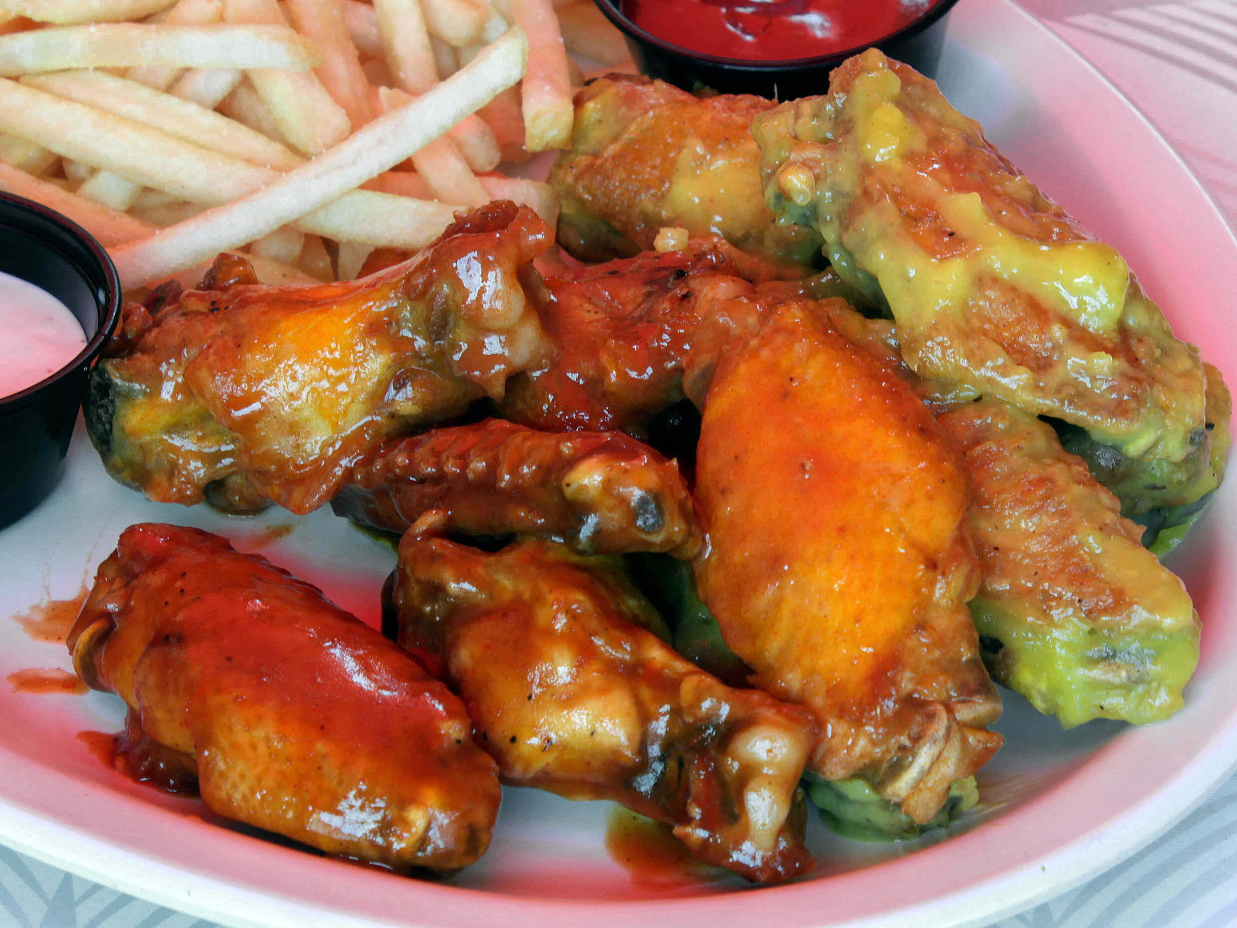 6 alitas de pollo acompañada la salsa de tu elección servida con papas fritas.