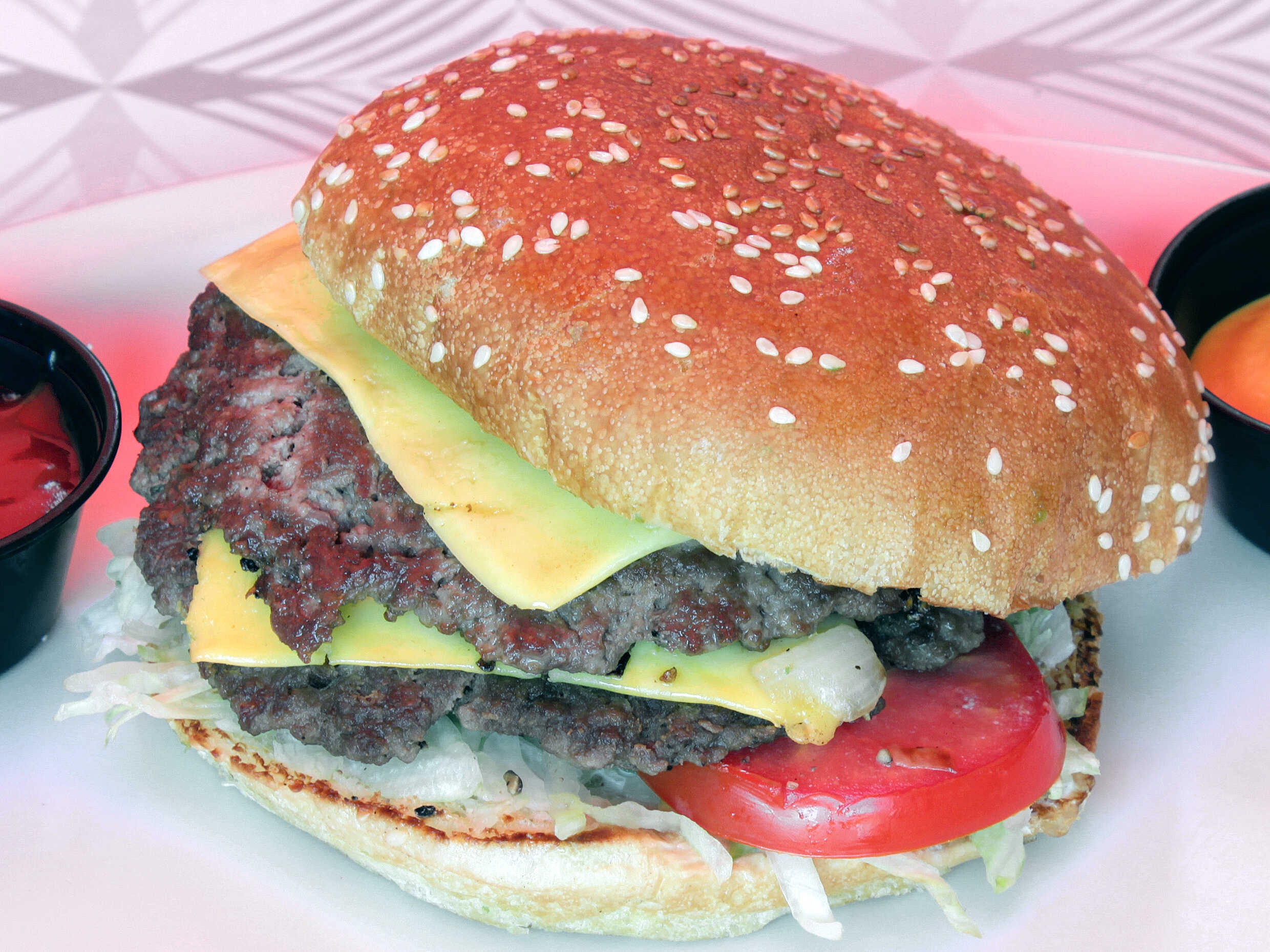 Doble carne 100 % de res, doble queso, lechuga, jitomate, cebolla caramelizada, mayonesa servida en un pan grande.