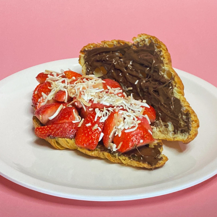 Croissant relleno de crema de avellana o chocolate + fresas con crema + dos toppings