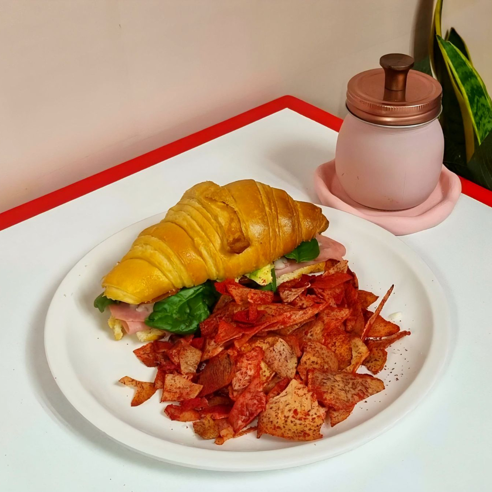 Jamón de pavo, espinaca, queso gouda, jitomate, aguacate. Acompañado con salsa macha y chips de malangas.