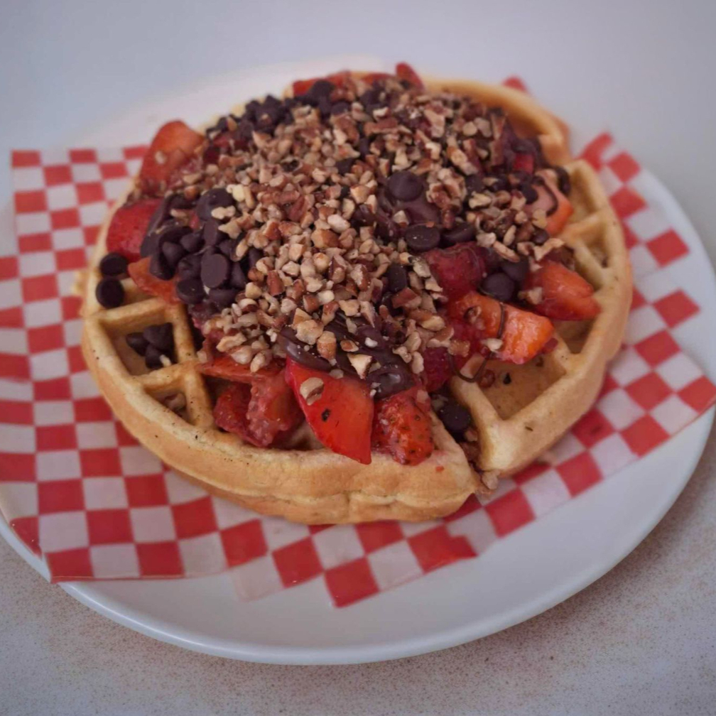 Waffle + fresas con crema + dos toppings