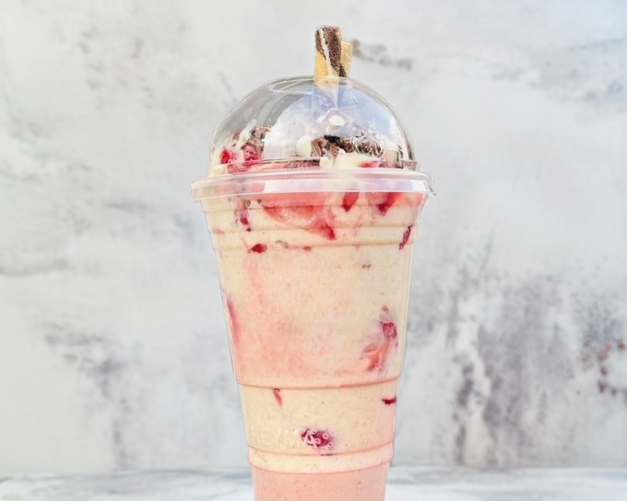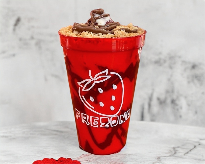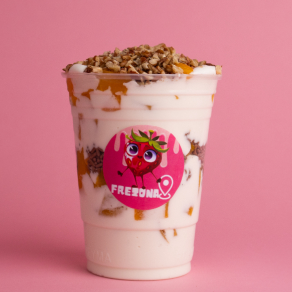 Fresas con crema en tu vaso coleccionable Frezona, disfruta de tu postre favorito con un toque de estilo.