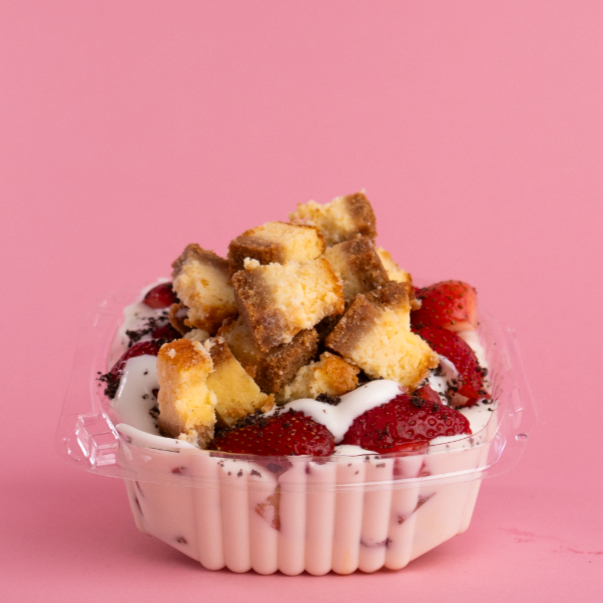 Vaso mediano de fresas preparadas con base de yogurt griego 0% y endulzado con monk fruit. tambien puedes convertir tu orden en vaso grande por solo $30