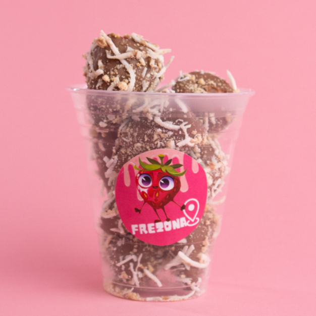 Vaso de plástico mediano (12oz) de fresas bañadas en crema gourmet de la casa y 2 toppings a elegir. también puedes convertir en vaso grande (16oz) por solo $30